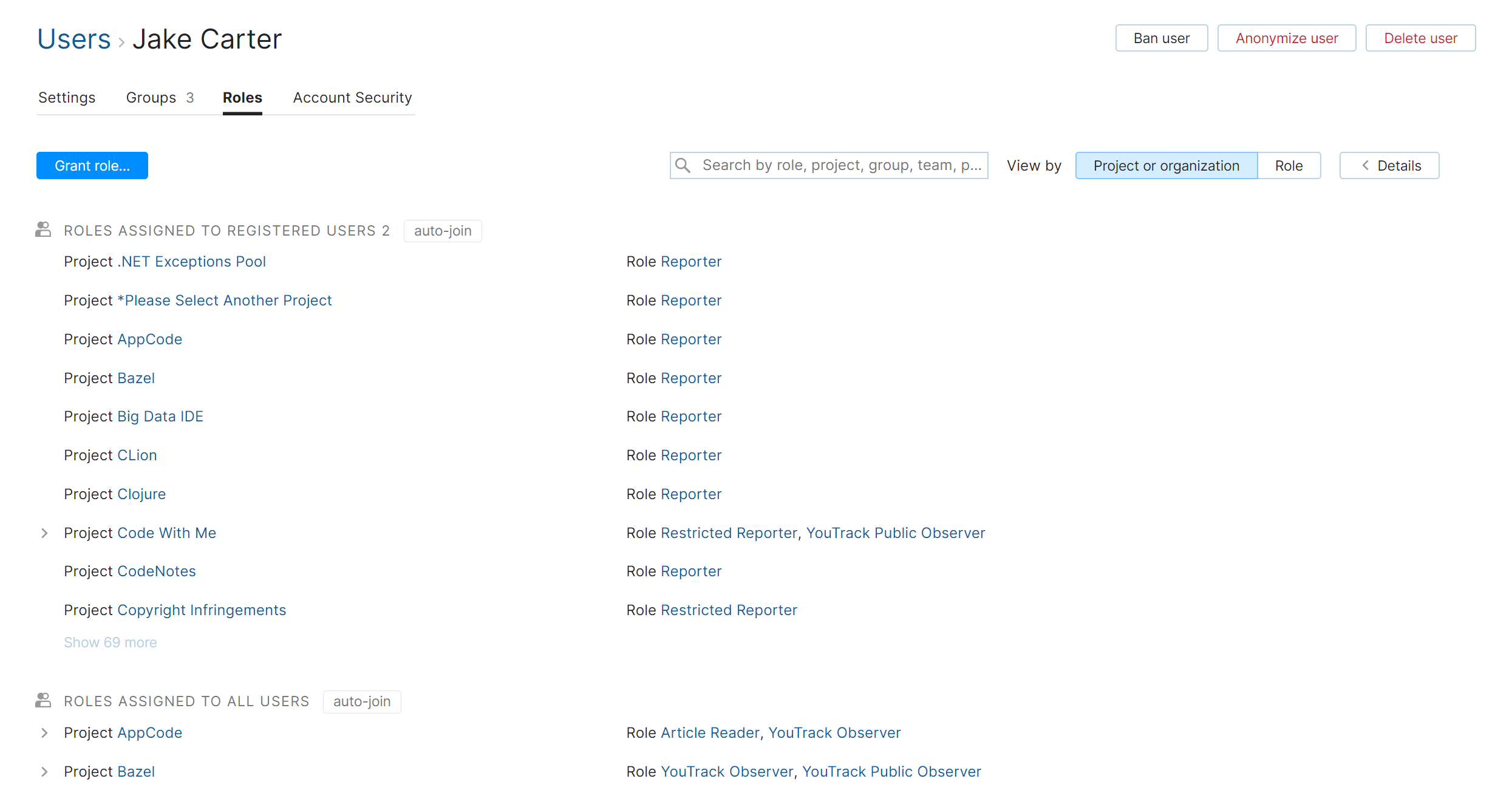 There are two views available on this tab. The default view shows the list of roles that are assigned to the user, listed by Project or organization.