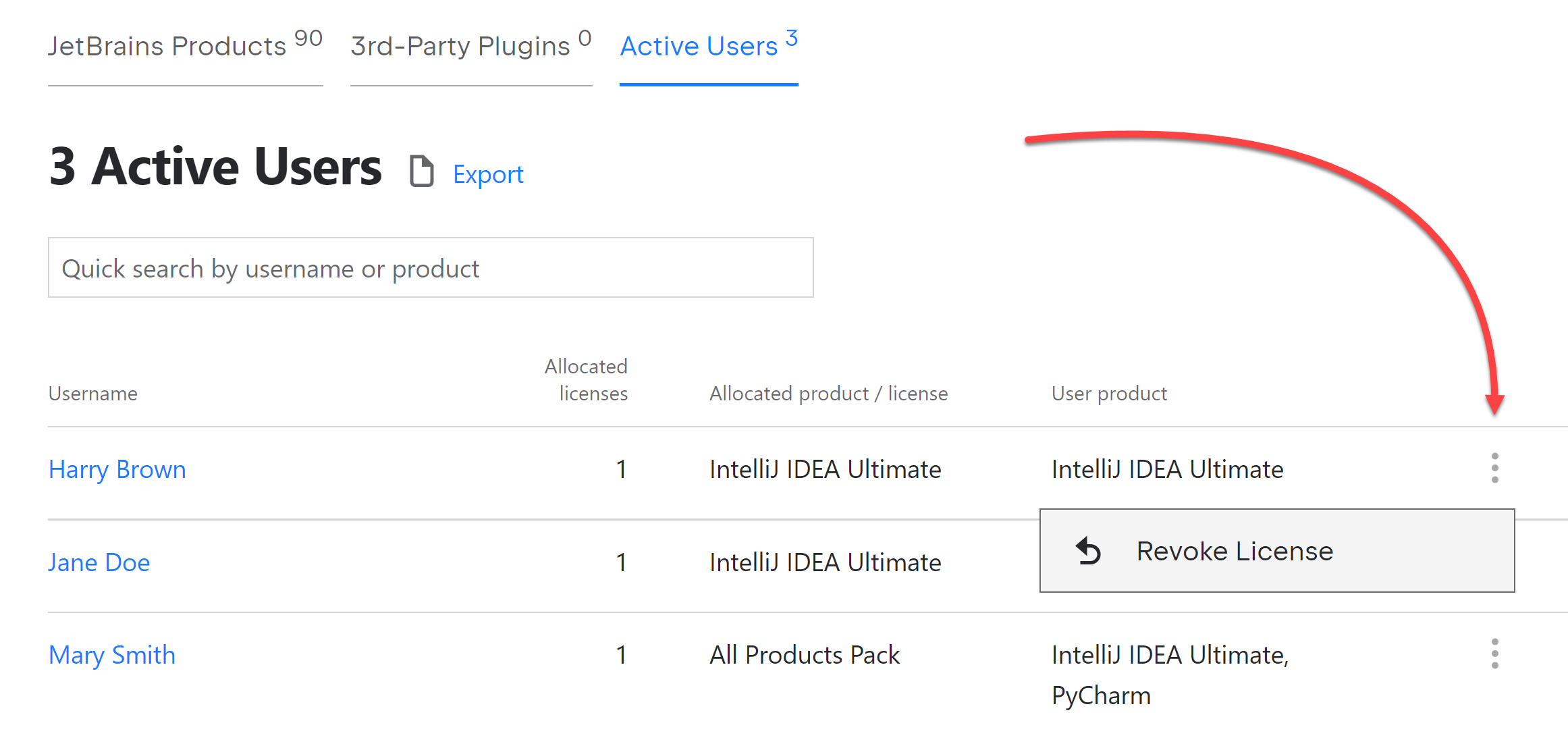 Find the user whose license you need to revoke. You can use the quick search box above the user list.