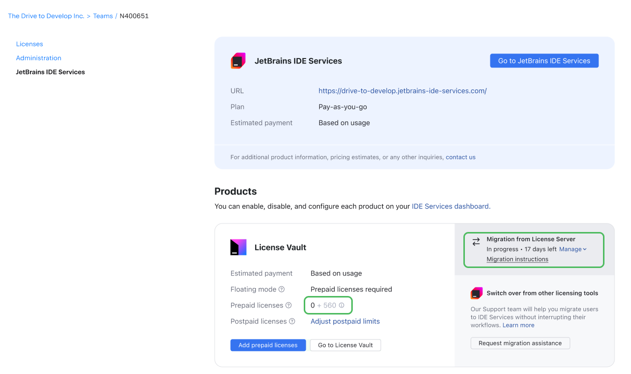 You can check the status of the started migration on the IDE Services management page in your JetBrains Account. In the License Vault section you'll find the remaining migration period and the number of licenses that will be migrated from your License Server to IDE Services at the end. The license count is constantly checked and updated, so it might change if you remove some of the licenses from License Server or if they expire during the migration period.