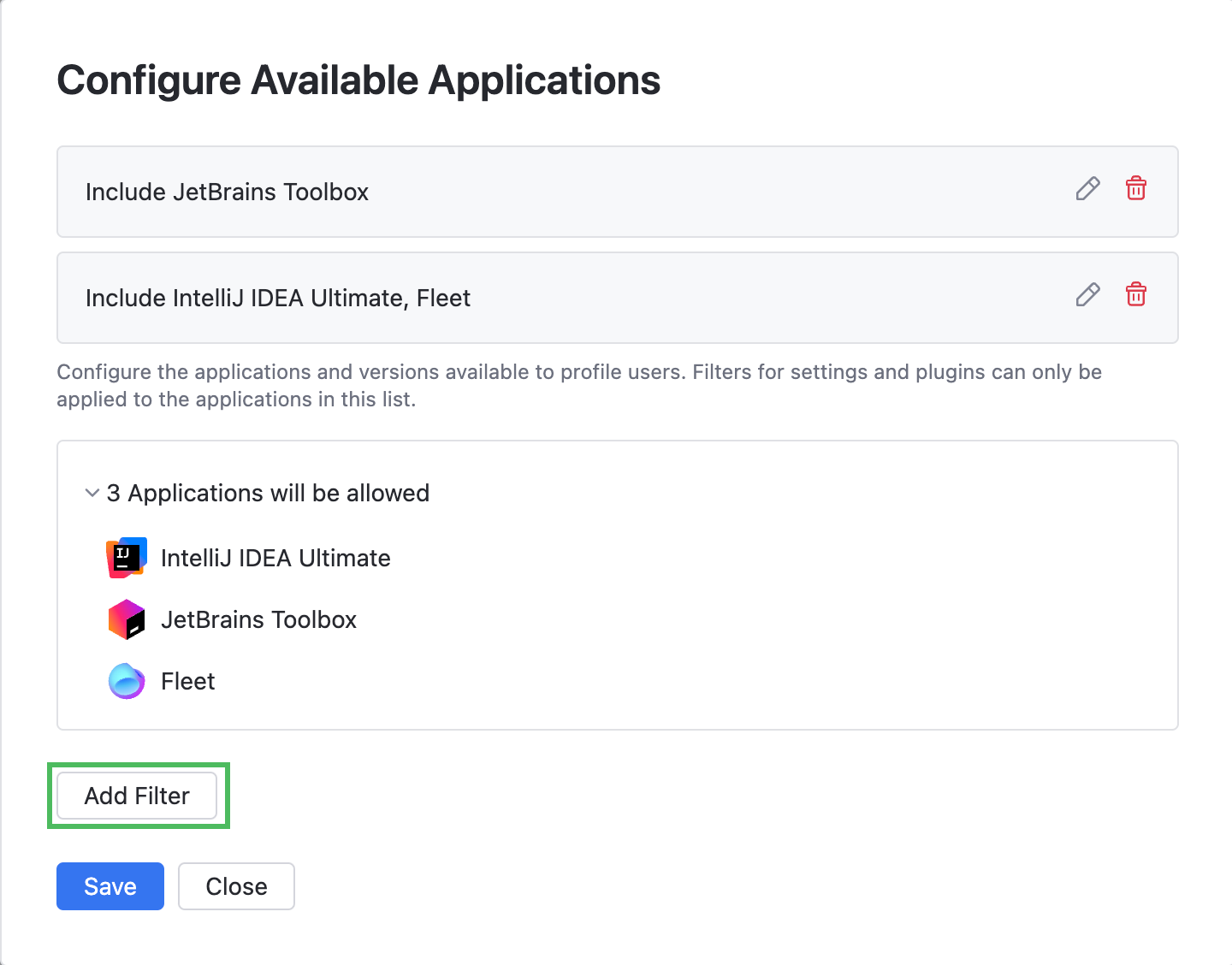 IDE Services profiles are based on filters. When setting up a new profile, you need to define the list of available JetBrains tools and their respective versions. This list determines the filters for settings and plugins. When you distribute a plugin or propagate a setting to all IDEs enabled in the profile, IDE Services will use the configured list of available applications.