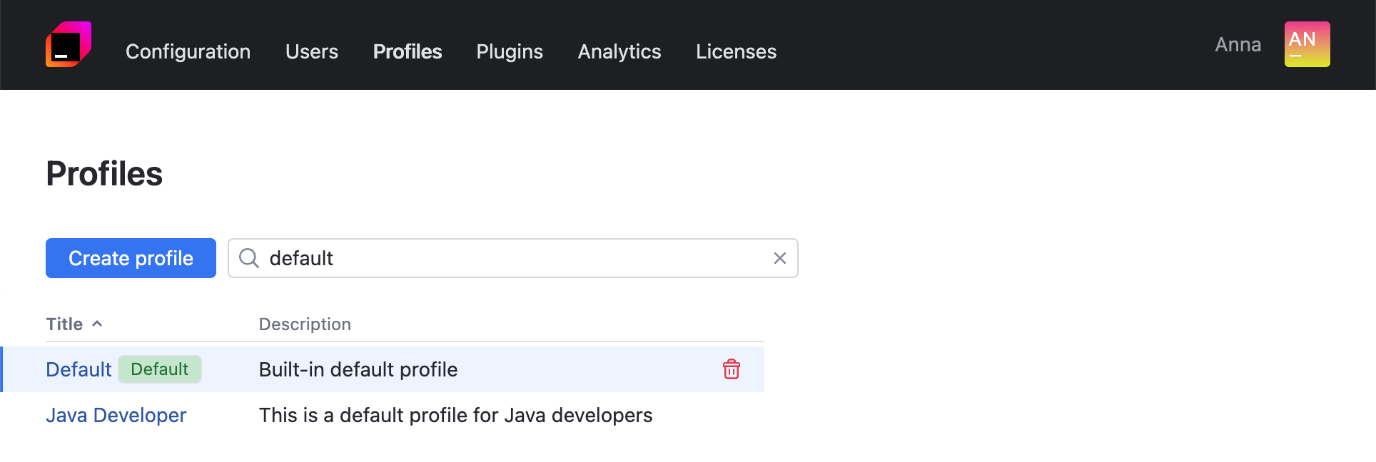 Each profile is set up to include everything a developer needs to fulfill their work duties. For example, John is a Java developer and the corresponding Java Developer profile is assigned to their user in IDE Services. This profile gives access to the latest versions of IDEs in the Toolbox App, and enables AI-powered features in available JetBrains tools.