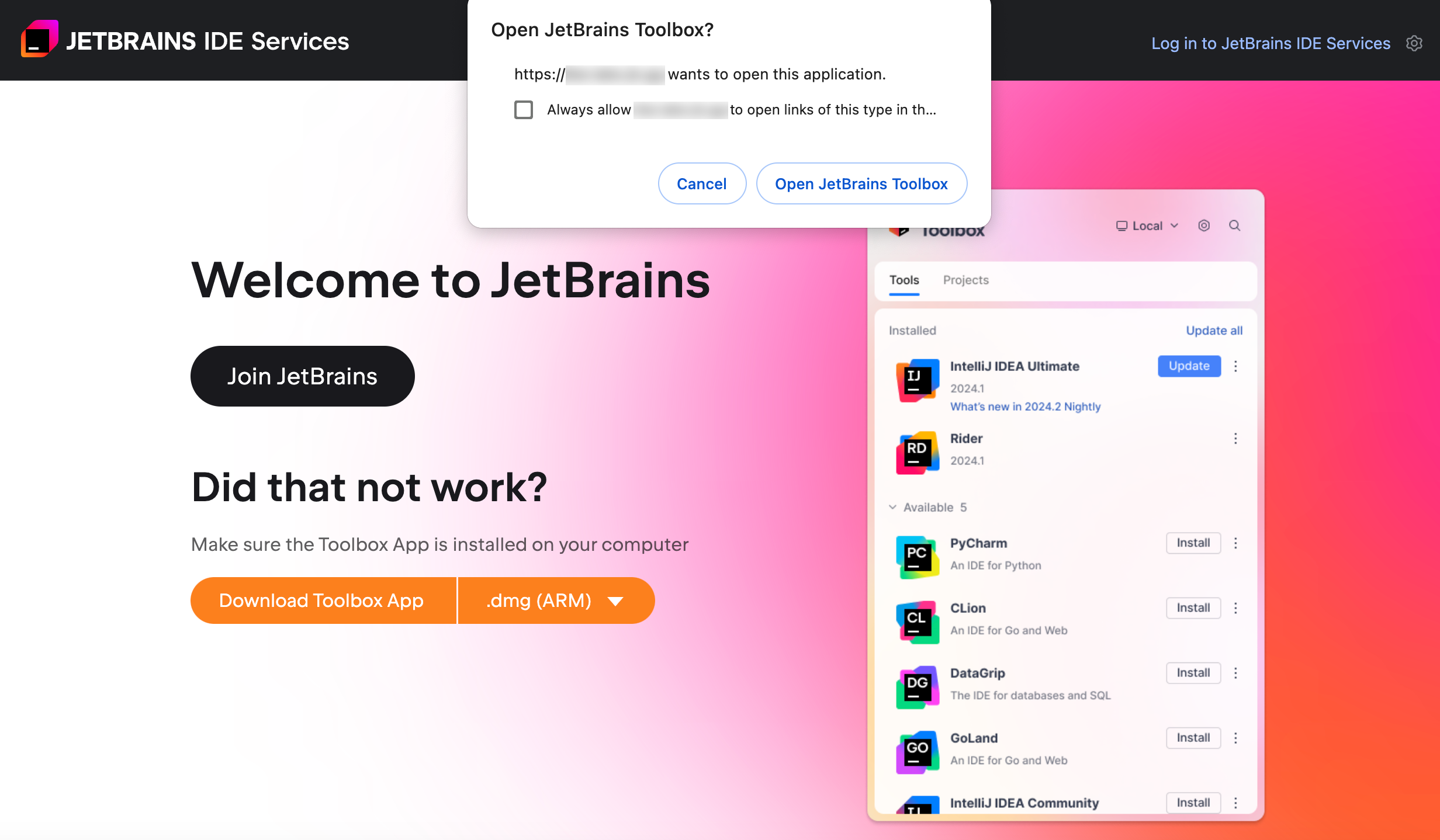 Before connecting to the company's IDE Services Server, you need to download and install the Toolbox App from the JetBrains website. The Toolbox App acts as an intermediary for managing IntelliJ-based IDEs and simplifies downloading, updating, and configuring your IDEs.