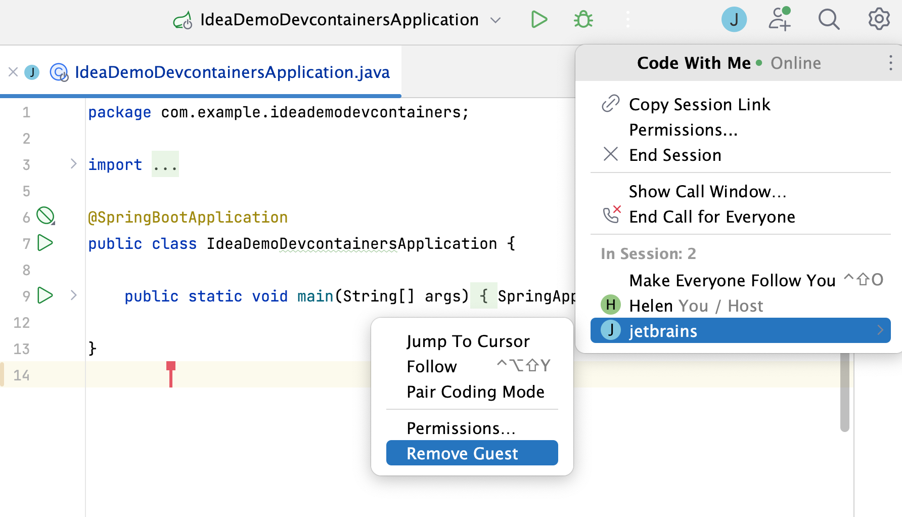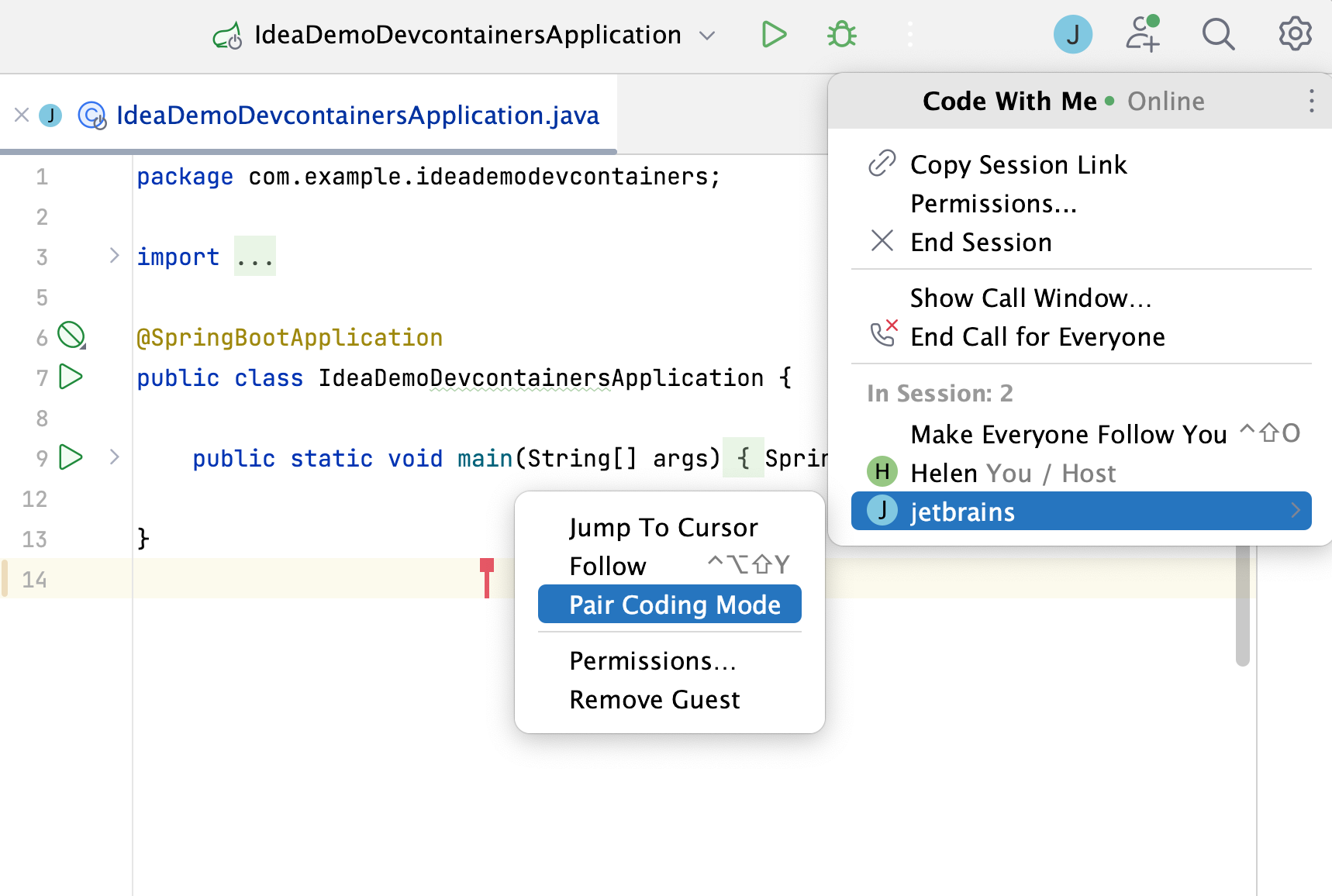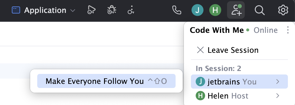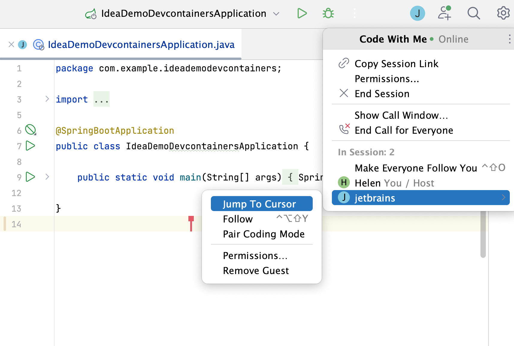 In a shared session you can try different things such as move around the host's project independently, follow other participants, use the terminal tool window, make code edits, request additional permissions from a host, and so on.