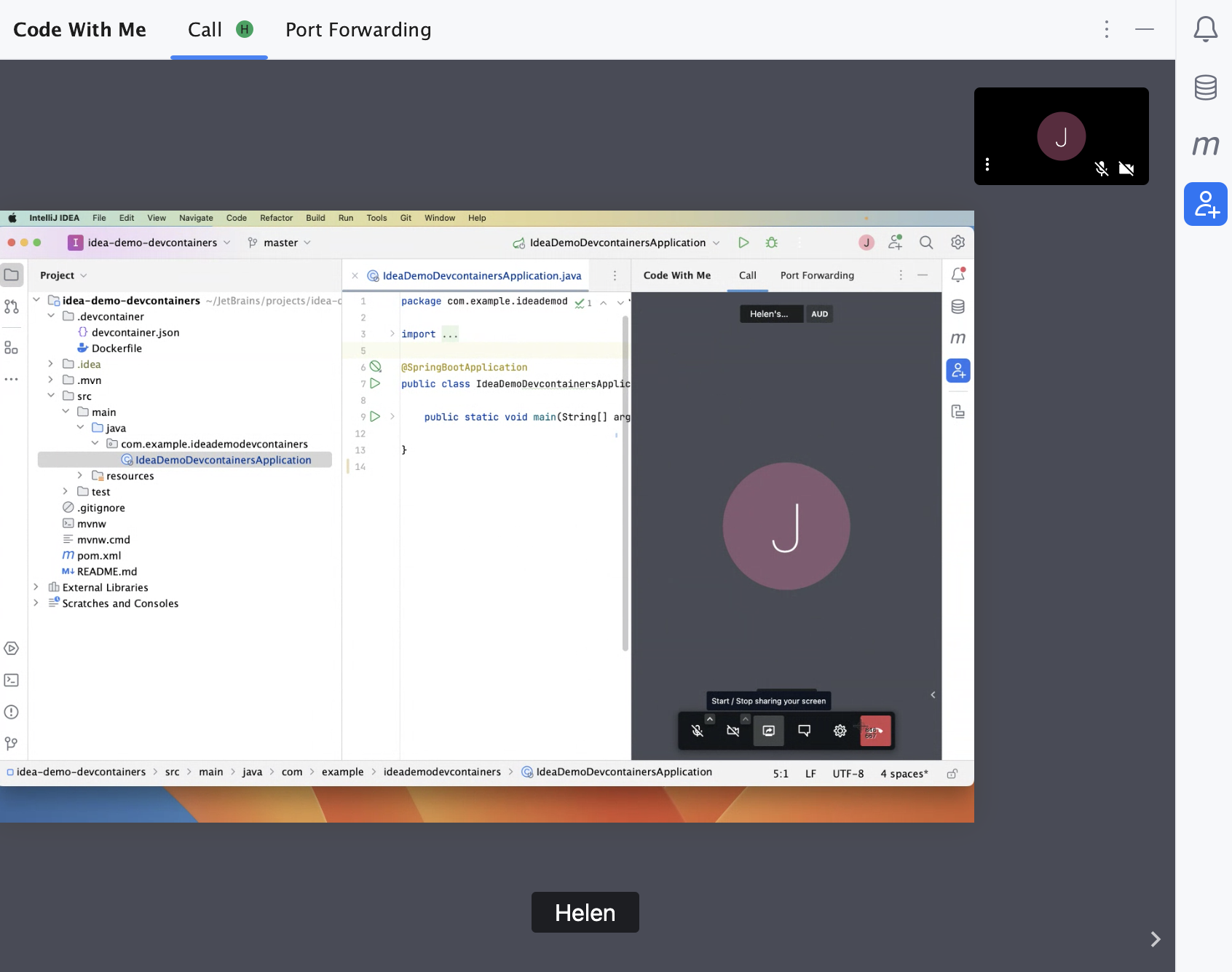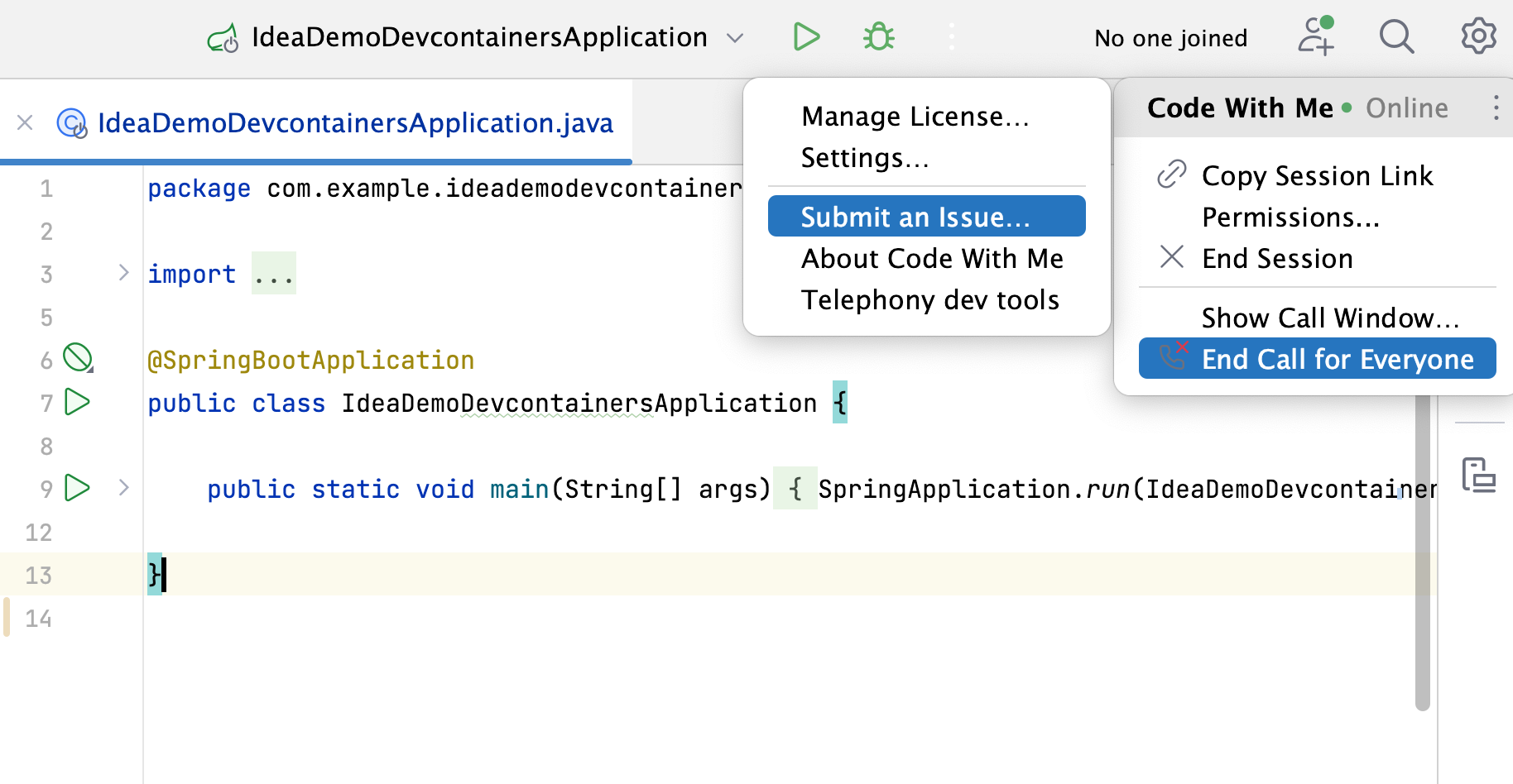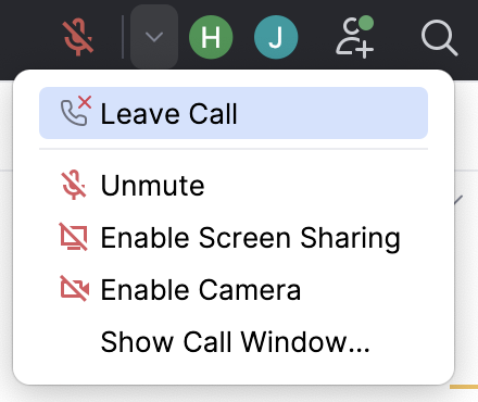 You can also control the call, camera, and screen sharing in the Code With Me tool window.