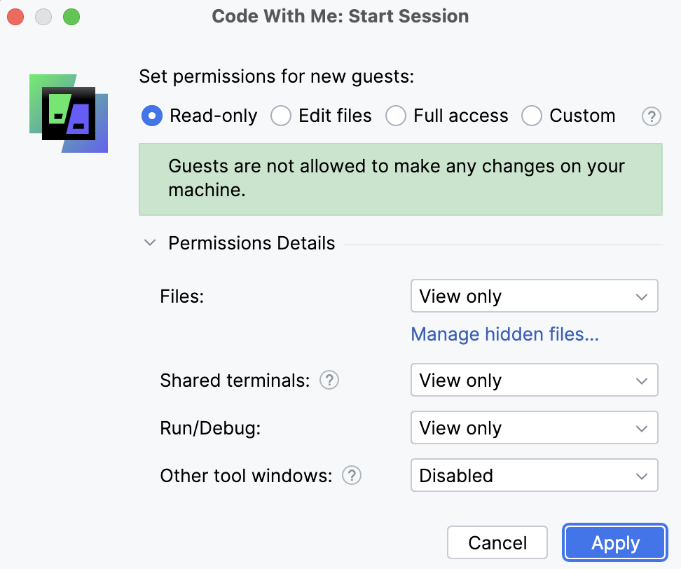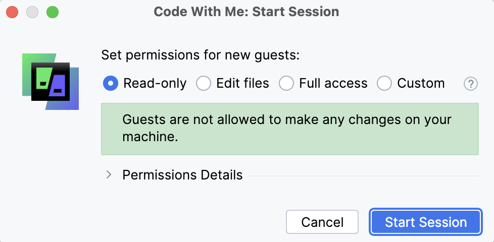 In the Code With Me: Start Session dialog, configure the access permissions for your guests and click Start Session.