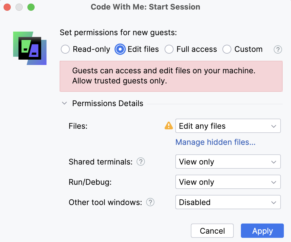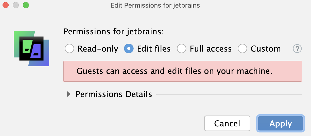 You as a host can configure what new guests may or may not access on your machine. For example, specify whether the guests can edit files, use the terminal, and execute code. You can also enable or disable the voice call option. The permissions can be configured for the whole session or for specific guests in the session.