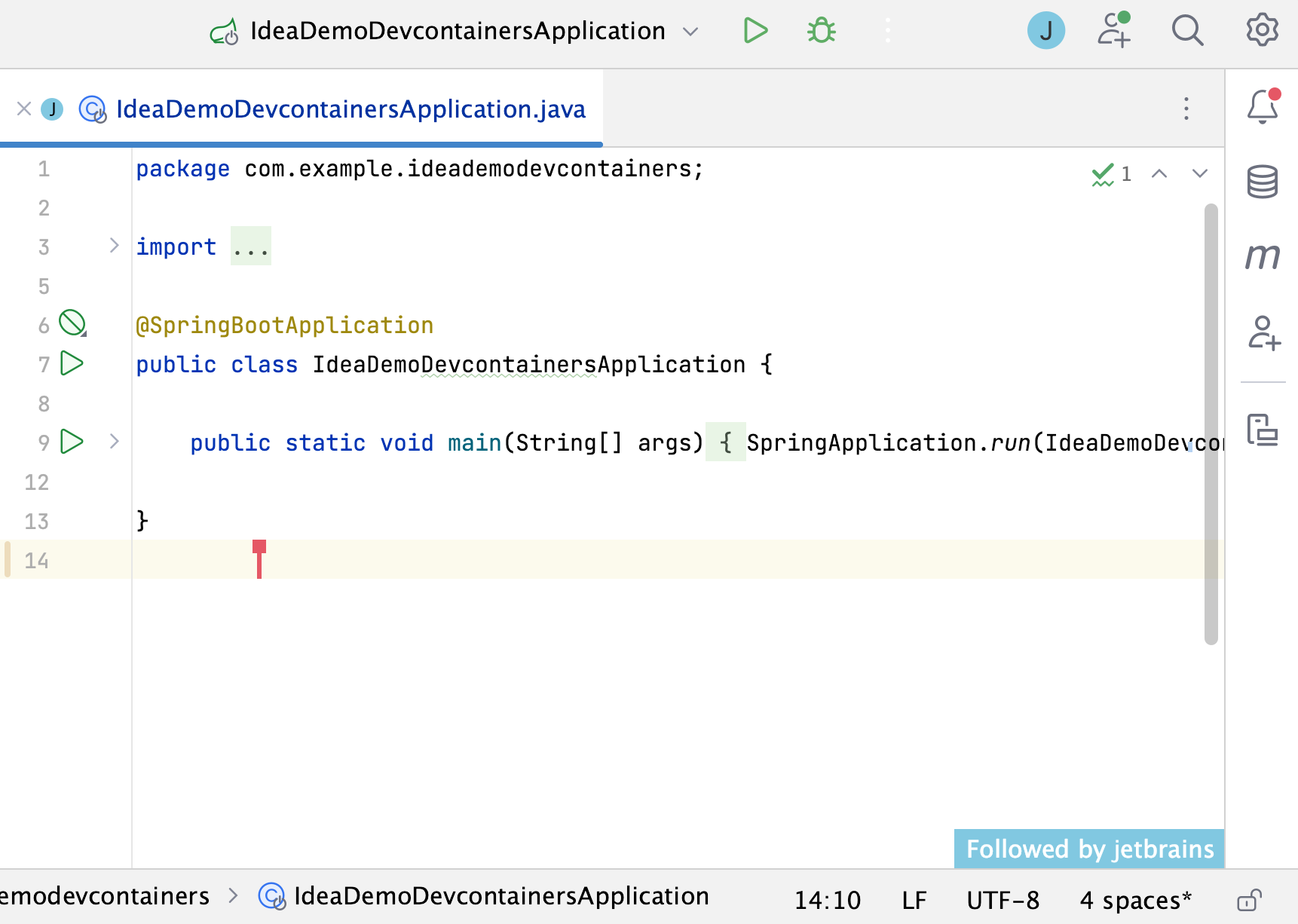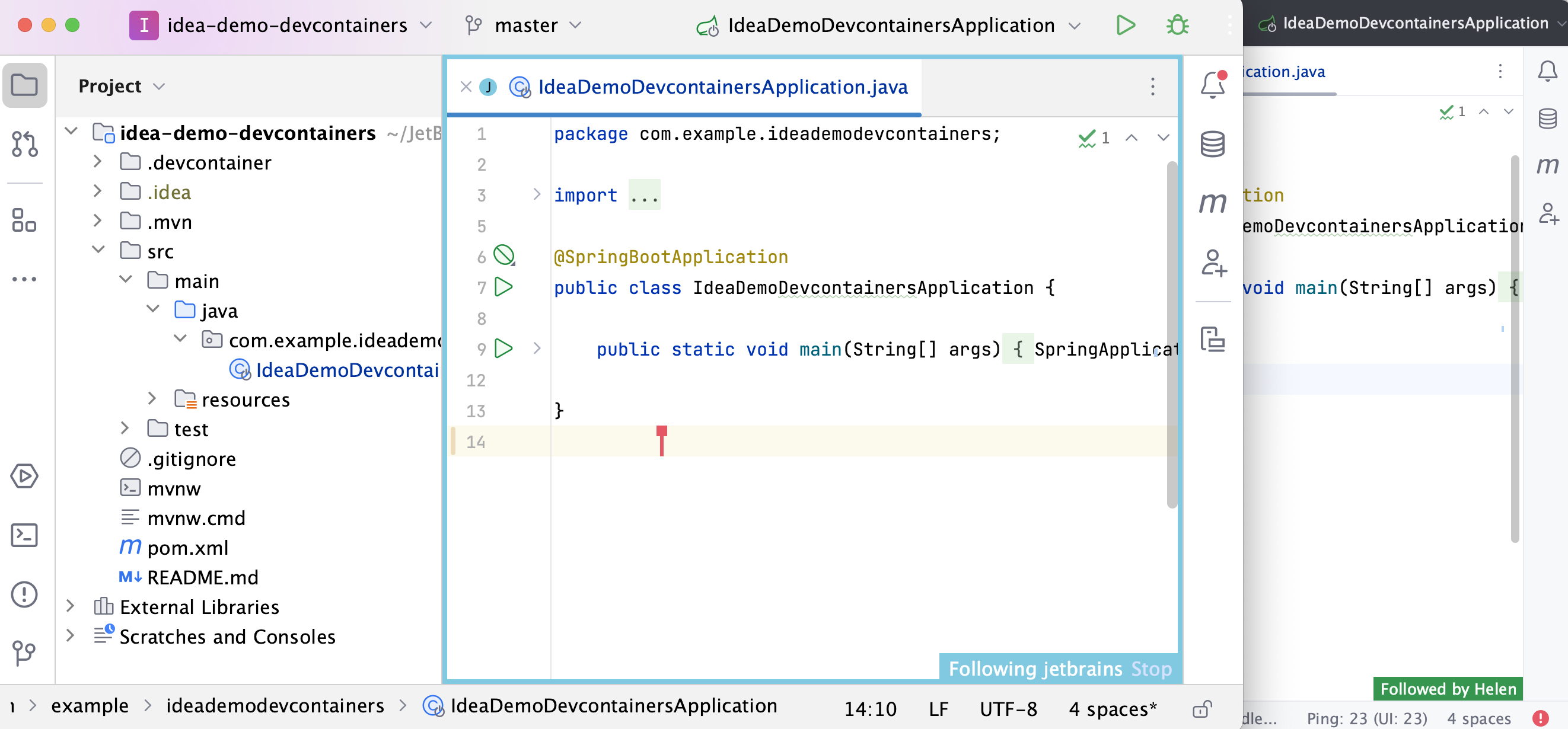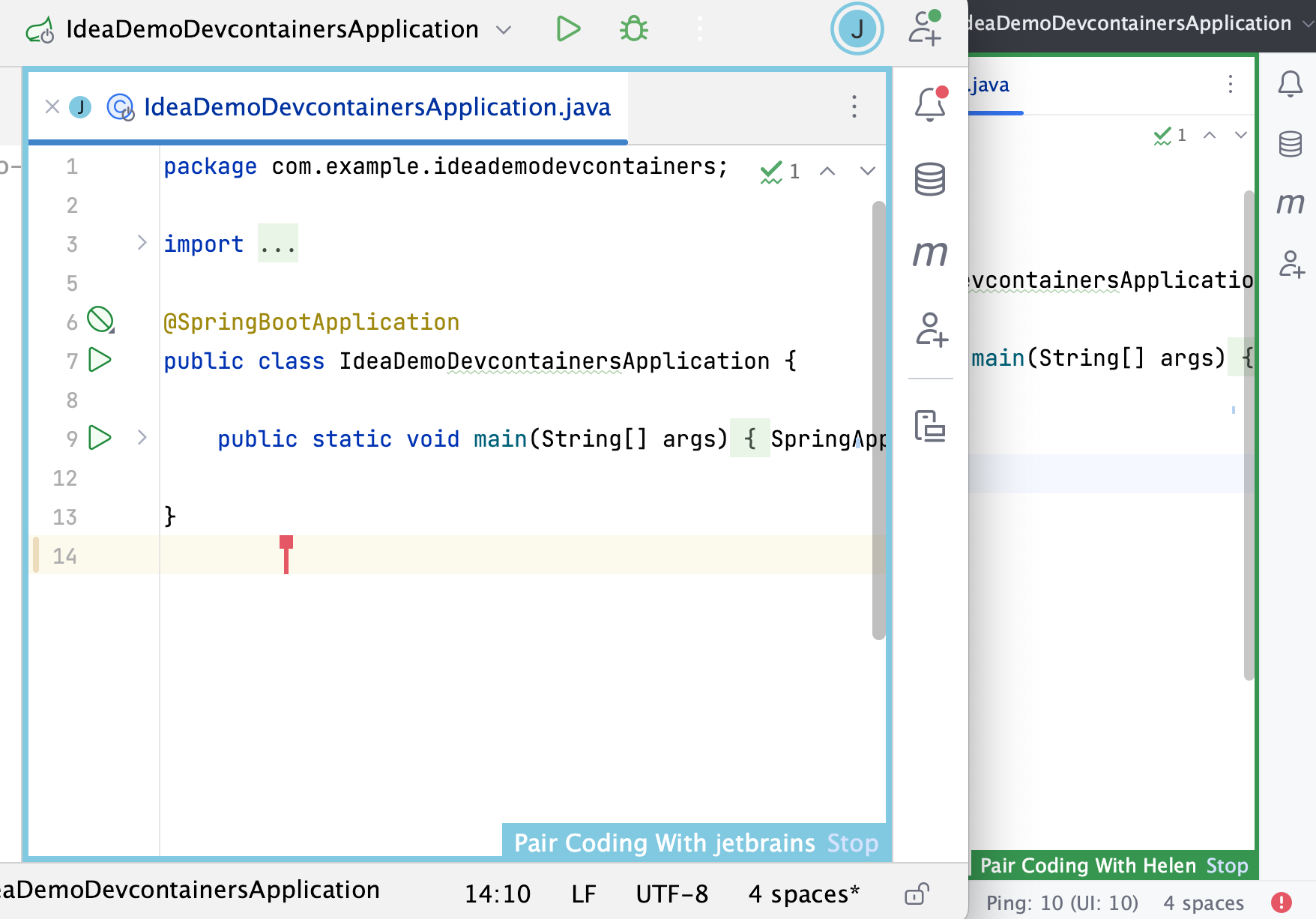 The caret is placed on top of the host's caret. IntelliJ IDEA places a frame around both the host's editor and the guest's editor indicating that the pair-coding mode is on.