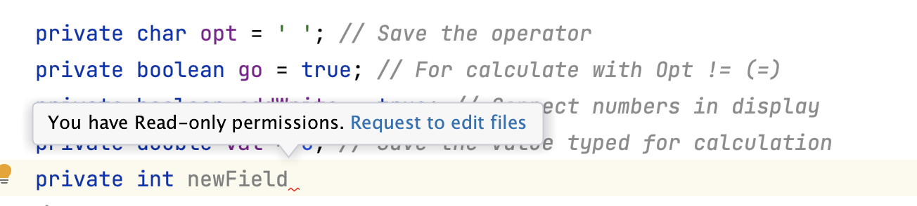 By default, you, as a guest, are given the Read-only permissions. That means you can't edit files, add the code, or work in the terminal during the session. IDE Services displays a proper notification every time you try to something for which you don't have permissions. You can click the link in the notification to request additional permissions from the host.