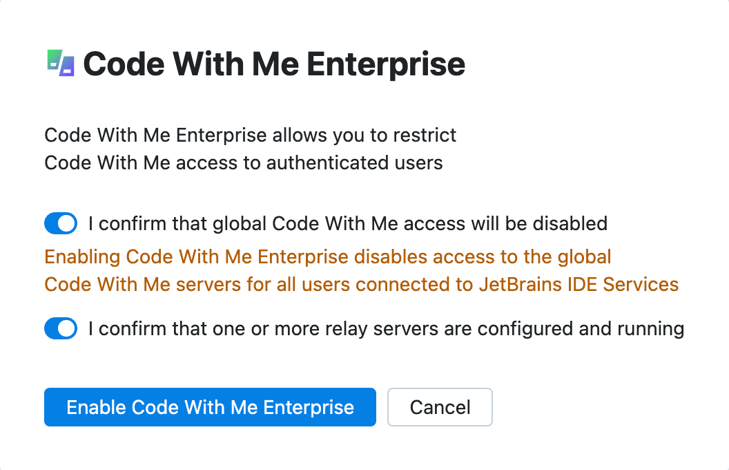 I confirm that one or more relay servers are configured and running: Code With Me Enterprise requires a relay server for proper functioning. Learn how to configure and start a relay server.