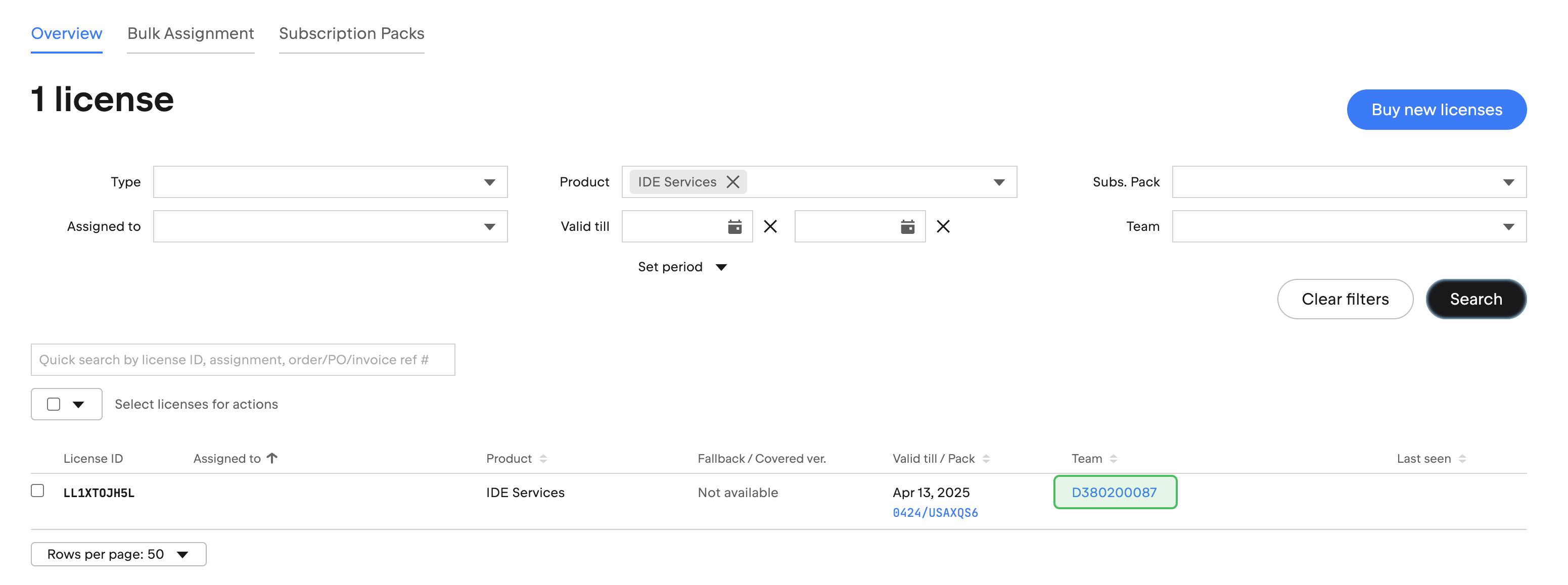 Once you locate the IDE Services license in the license table, check the penultimate column of the table to find the name of the team to which the license belongs. That's your IDE Services team.