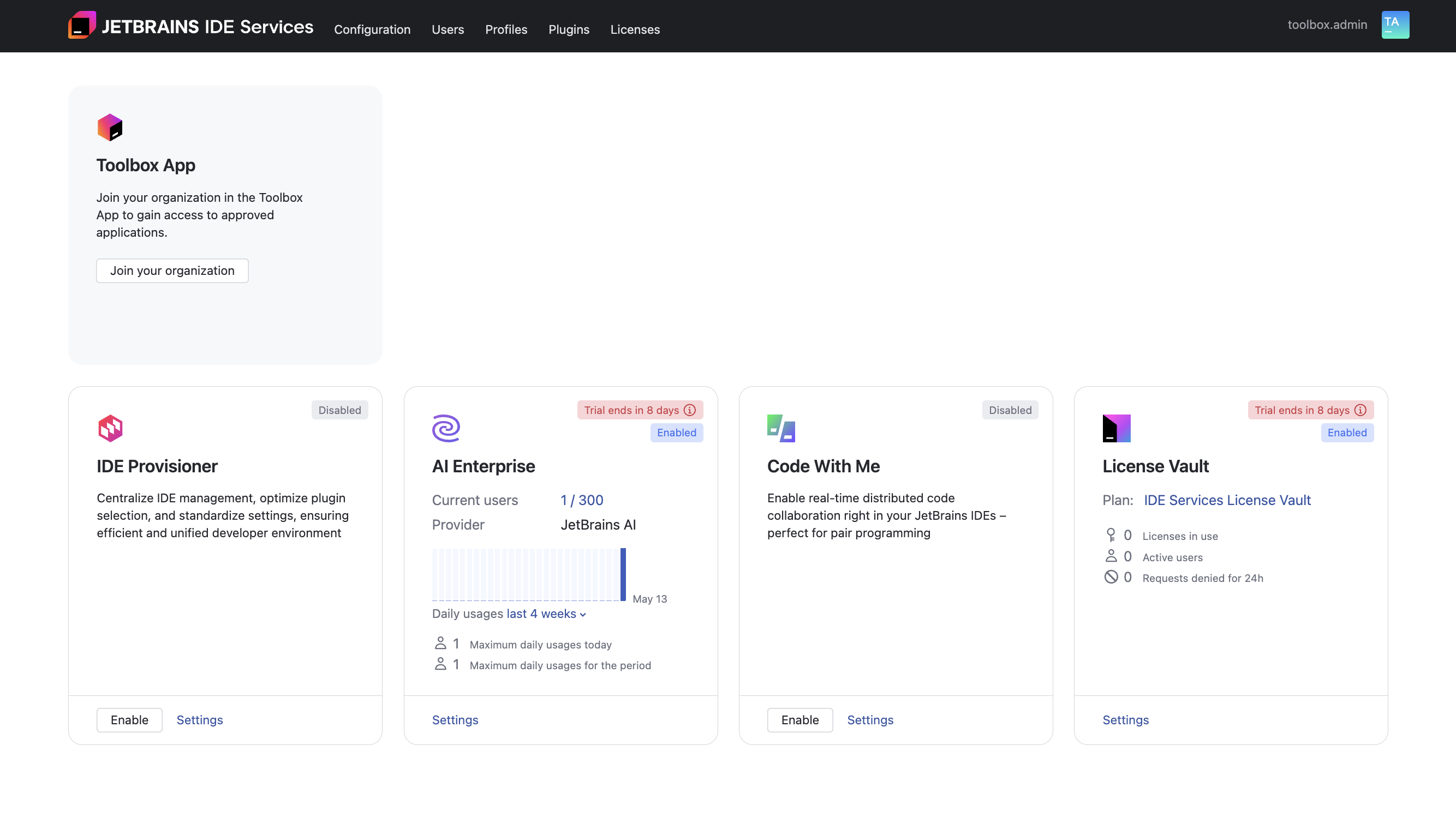 Lets you try IDE Provisioner, AI Enterprise, Code With Me Enterprise in your organization. Read more.