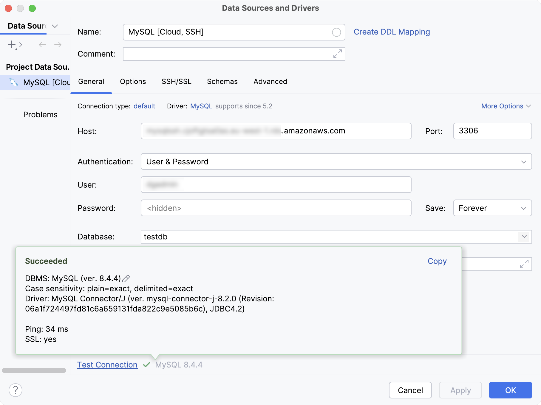 Let us consider the following example. MySQL database is running remotely in a cloud, the connection has to be established through a jump host. You need to authenticate using your encrypted private key file. To create a data source and run a test connection to your database, do the following:
