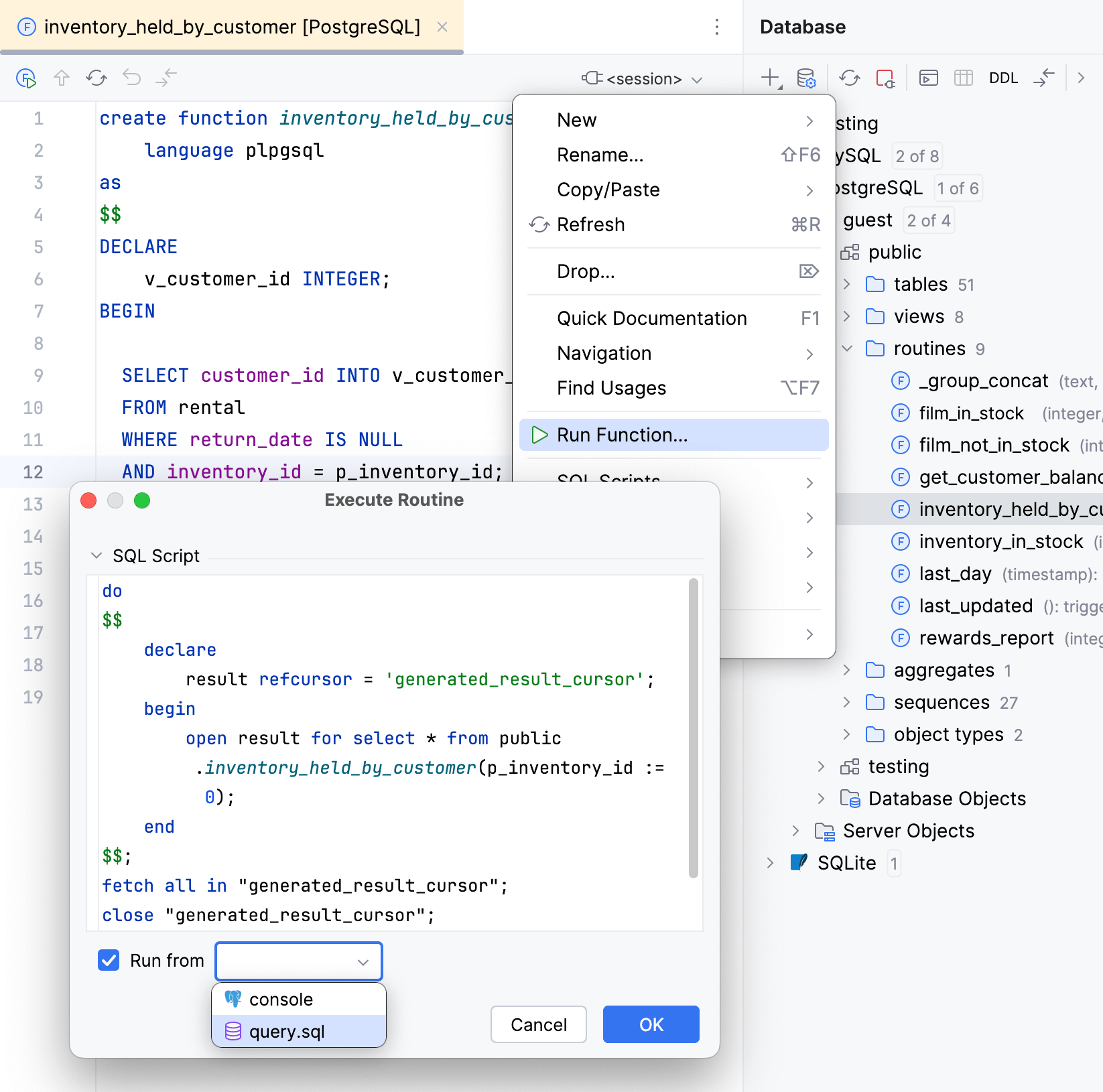 You can run your queries by using shortcuts, toolbar buttons, a context menu, and run/debug configurations. You can do this from query consoles, scratch files, and user files.