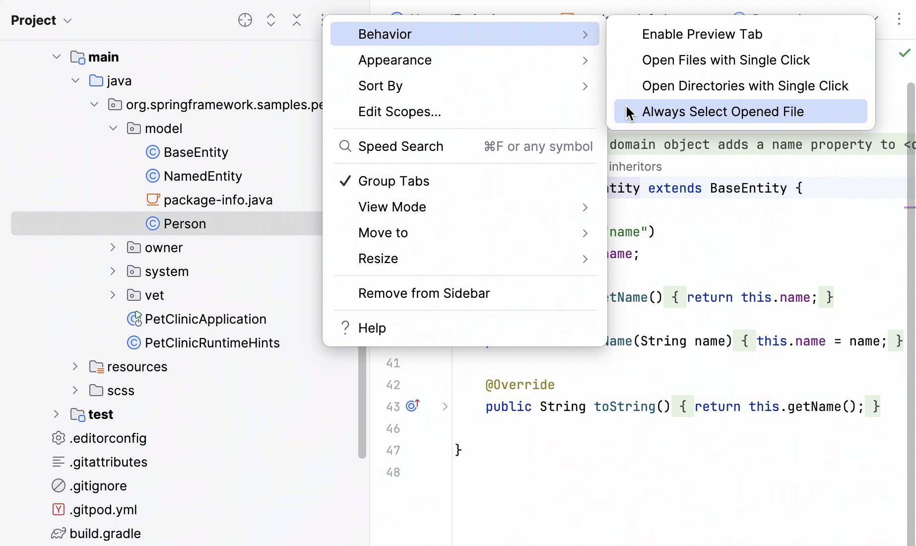 Always Select Opened File: auto-select the file that is currently open in the Project view.