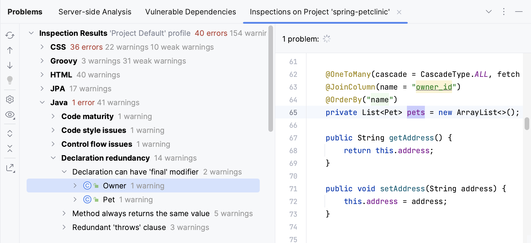 This tab displays problems detected across your project by the project-wide analysis.