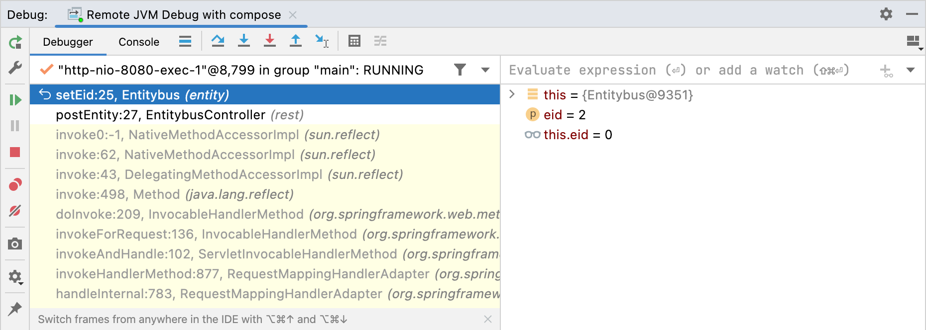 Open the EntitybusController.java file and set a breakpoint somewhere inside the