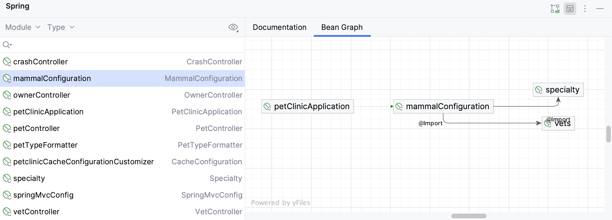 The Bean Graph tab allows you to view graphs of the direct bean dependencies. For complex graphs and more advanced interaction (such as exporting diagram or showing diagrams of library beans), refer to Spring diagrams.