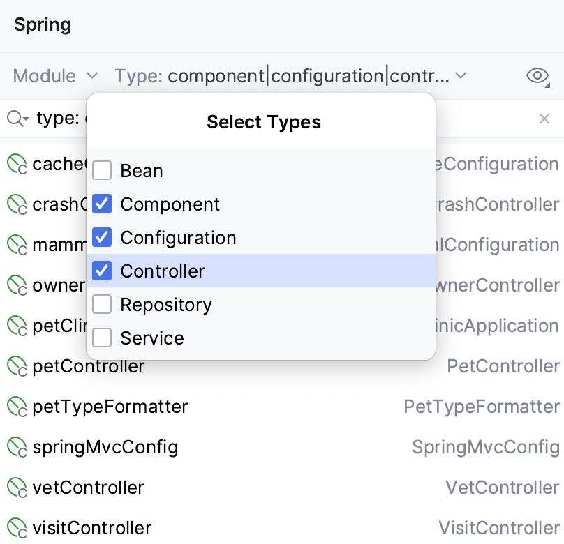 Click Type to filter beans by type. To show multiple types of beans, click Select.