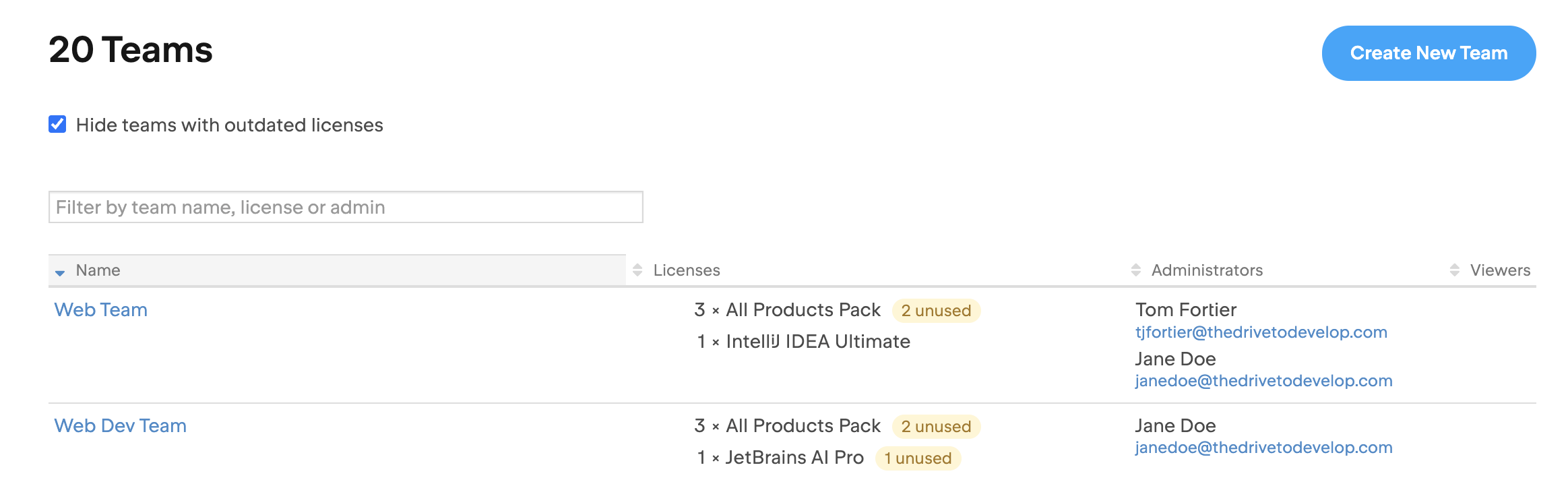 To only see teams with active licenses, select Hide teams with outdated licenses at the top of the list. This hides any teams whose licenses all expired more than a month ago.