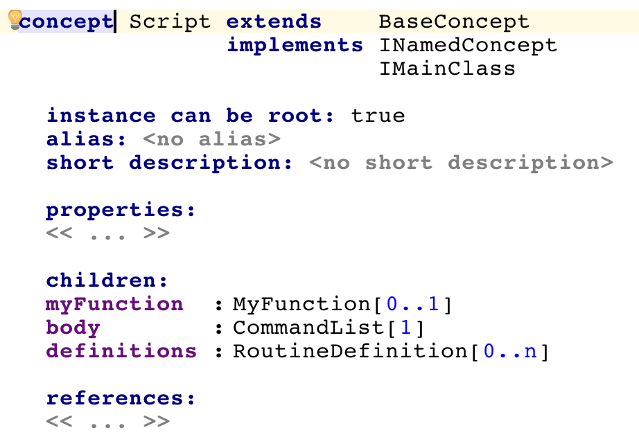 Concept functions allow language designers to leave hooks for their language users, through which the users can provide code to leverage in the generated code. For example, most of the languages that MPS offers for language design, such as Editor, Constraints or Intentions, leverage Concept functions: