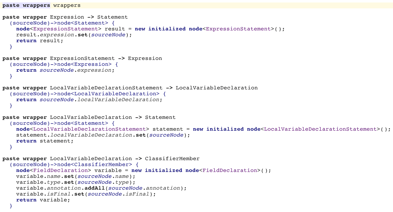 These allow you to customize pasting of nodes into other contexts. For example, if you copy a LocalVariableDeclaration in BaseLanguage and paste it into a ClassConcept to make it a field of the class, a simple transformation must be triggered that will create a new FieldDeclaration out of the LocalVariableDeclaration.