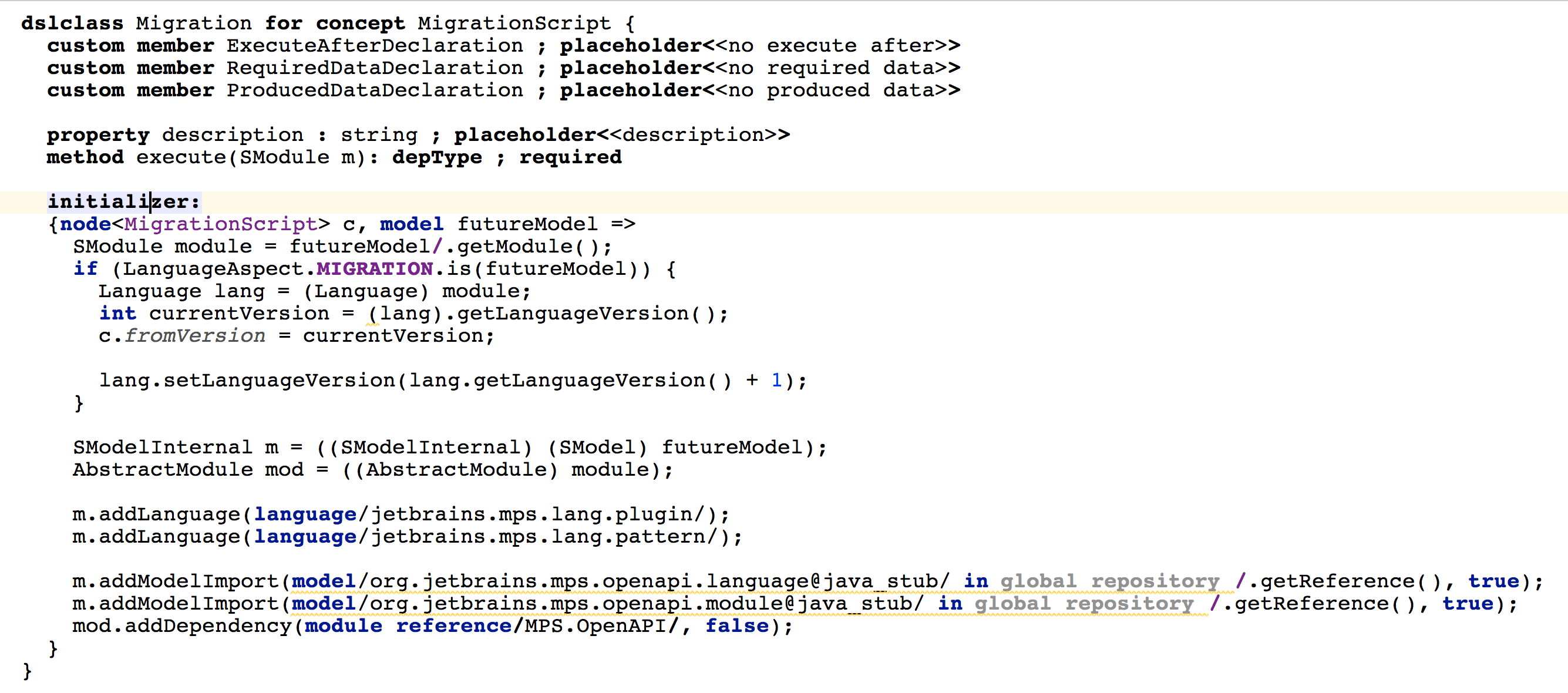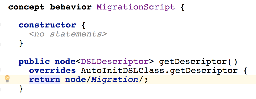 MigrationScript concept, which is a mere BaseLanguage class, is enhanced by the Migration DSLDescriptor that adds a few extra properties, members and custom members