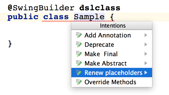 As soon as the annotation is added, the required elements defined in the DSLDescriptor or the ones with placeholders specified are added to the class. Deleting required elements will result in an error indicated on the class: