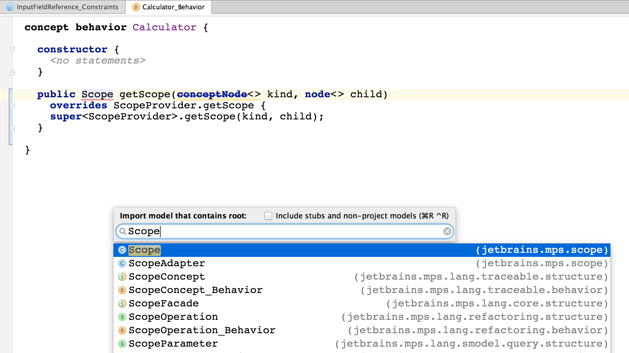 The Calculator in our case should return a list of all its InputFields whenever queried for scope of InputField. So in the Behavior aspect of Calculator we override (Control + O) the getScope() method: