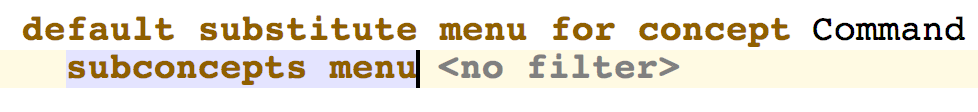 By defining a default substitute menu for a concept you may customize the contents of the completion menu, which displays when the user presses Control + Space. It also has effect on sub-concepts of the concept, unless these sub-concepts define their own default substitute menus.