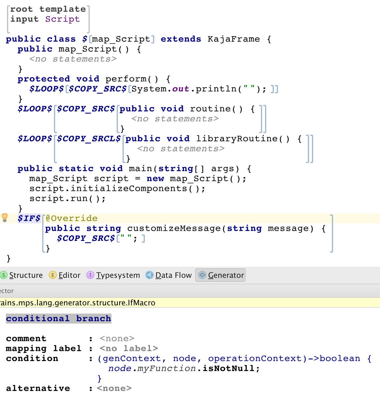 The generator template that defines how a class generated for a Script should look like, now has to generate a extra method that will override the customizeMessage() method in KajaFrame: