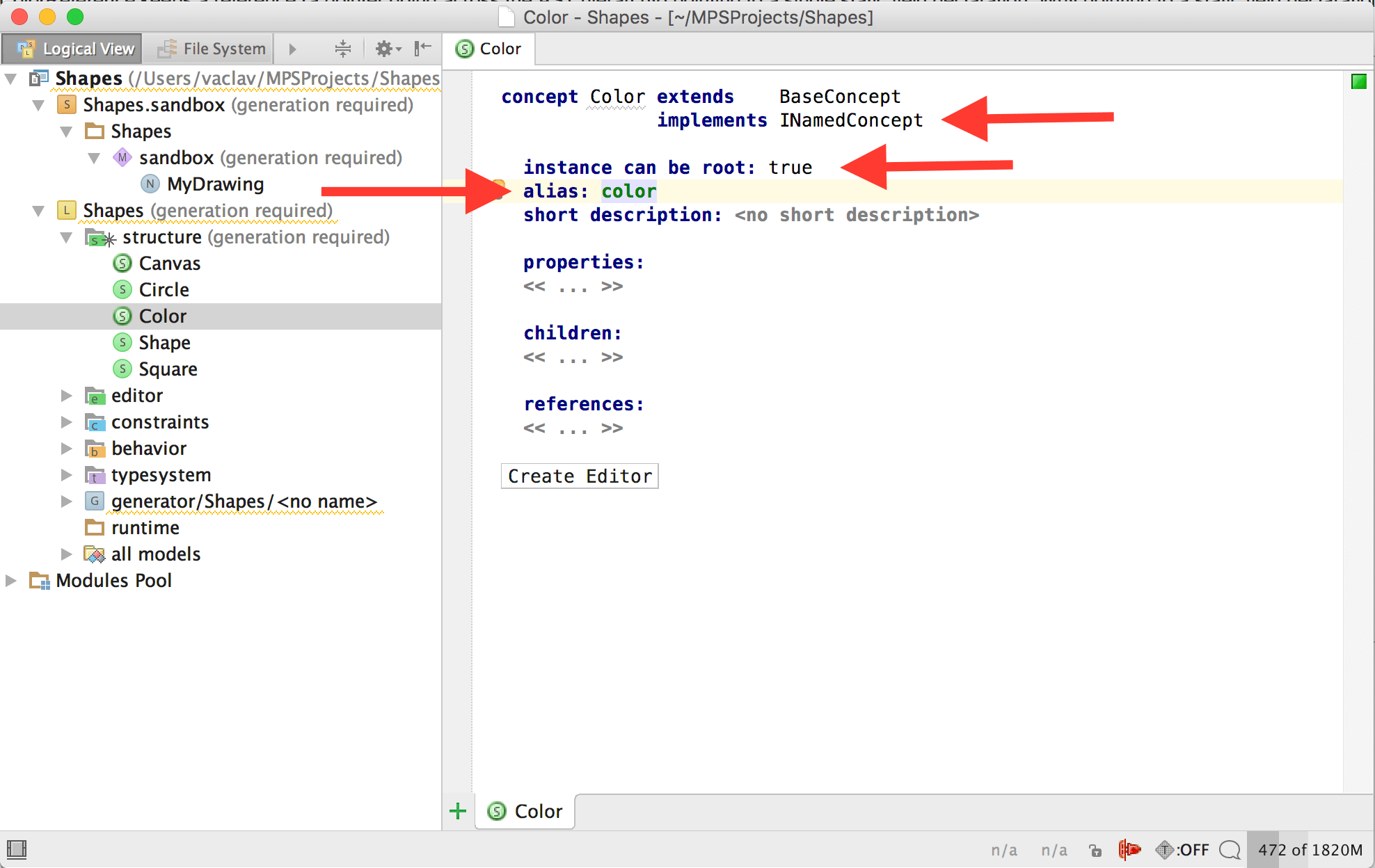 So this is our first concrete concept that will be used by users of our language. To give the concept a nice textual representation in code-completion dialogs and enable MPS to be smart about creating an instance of Circle whenever the user types "circle", you need to give the concept an alias 'circle'.