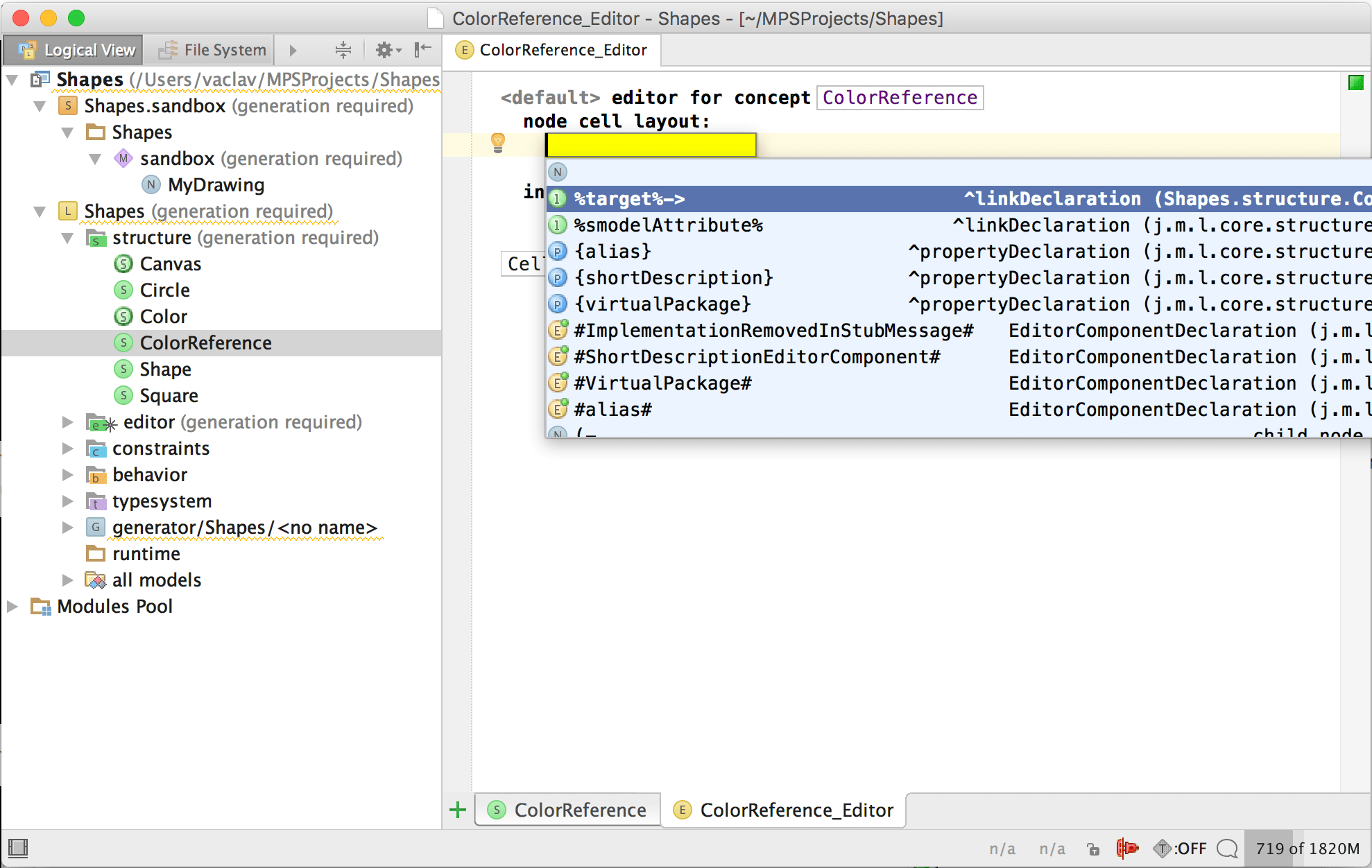 Circles should inherit capabilities from Shape, so we need to indicate than in the extends clause. Point at the beginning of the cell holding the "BaseConcept" text and hit the most useful keyboard shortcut in MPS - Control + Space - to invoke code completion. MPS will show you a list of options applicable as replacements for the "BaseConcept" text. We need to select Shape here to make Circle extend Shape.