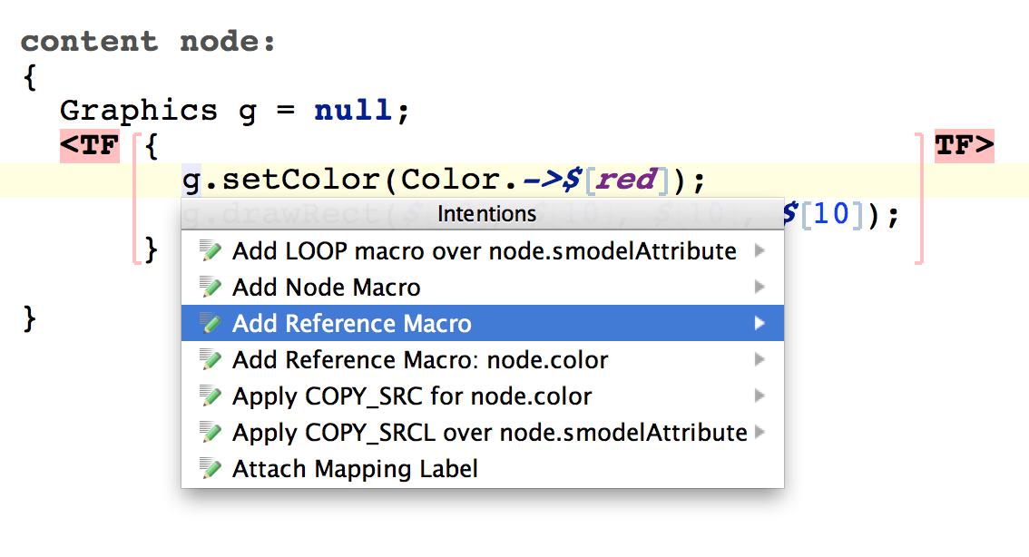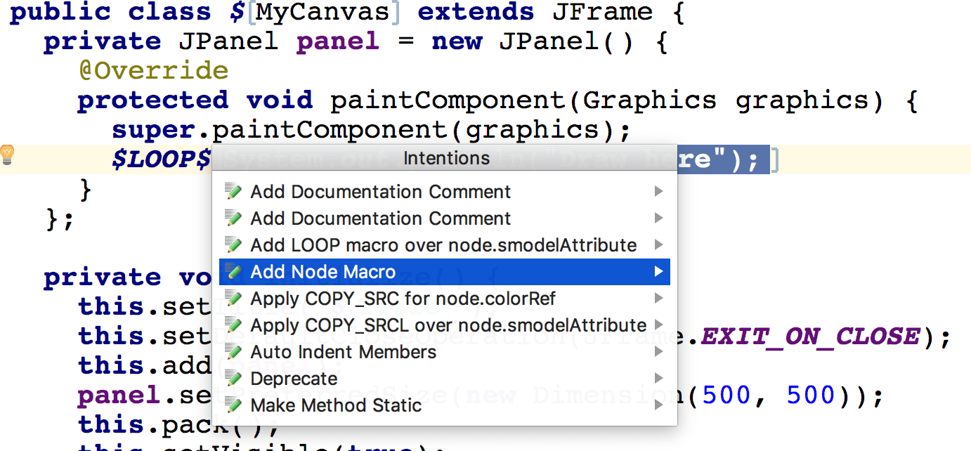 We, however, need to have the "System.out.println("Draw here");" statements replaced with code that draws each of these shapes. The COPY_SRC macro will do just that. Please, select the whole statement within the LOOP macro again, including the semicolon, hit Alt+Enter and choose Node macro.
