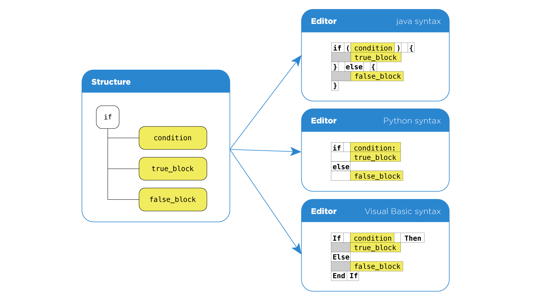 MPS differentiates itself from many other language workbenches by avoiding the text form. Your programs are always represented by an AST. You edit the code as an AST, you save it as an AST you compile it as, well, as an AST. This allows you to avoid defining grammar and building a parser for your languages. You instead define your language in terms of types of AST nodes and rules for their mutual relationships. Almost everything you work with in the MPS editor is an AST-node, belonging to an Abstract Syntax Tree (AST). In this documentation we use a shorter name, node, for AST-node.