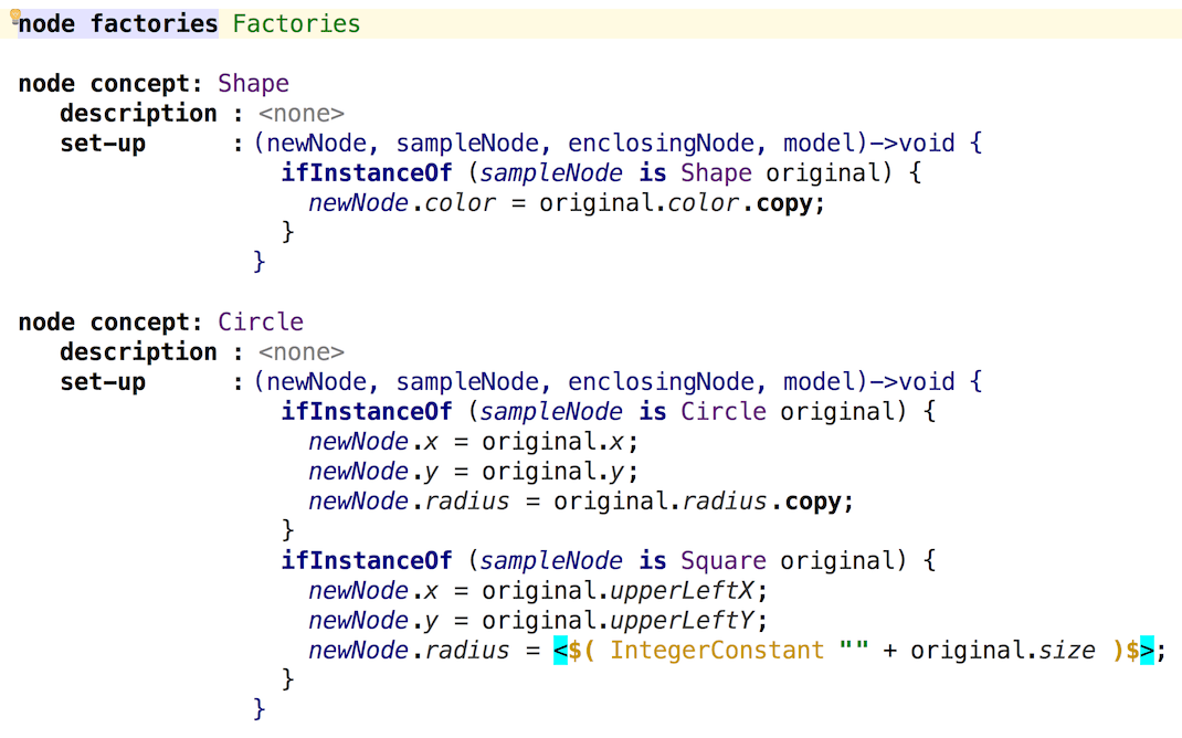 In brief, Node Factories allow you to customize instantiation of new nodes. In order to create node factory, you first have to create a new Node Factories root node. Inside of this root you can create node factories for concepts. Each node factory consists of node creation block which has the following parameters: newNode (the created node), sampleNode (the currently substituted node; can be null), enclosing node (a node which will be the parent of newNode in the model), and a model. The node factory handler is invoked before the new node gets inserted into the model.
