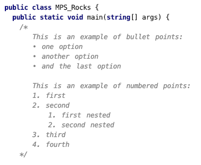 The jetbrains.mps.lang.text language has been enhanced with several rich-text editing capabilities. These capabilities are also available in single and multi-line comments in BaseLanguage.