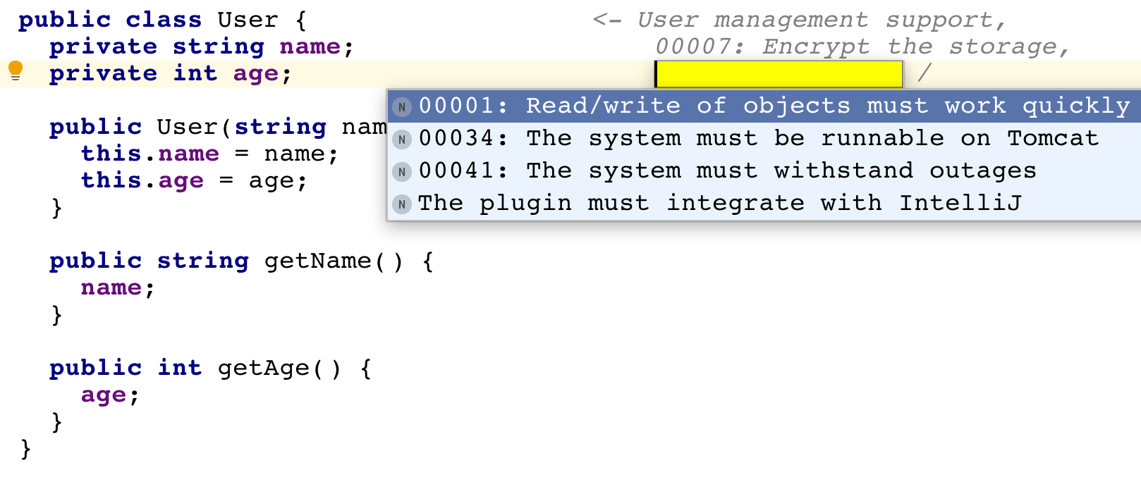 This allows requirement traces to be inserted into code. An intention is available to add/remove traces to a node.