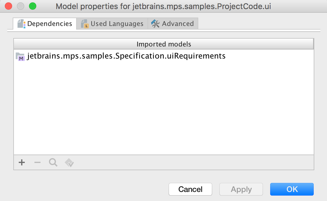 The Dependencies of the models must hold the models of the Specification solution, the requirements of which are relevant for code in the model. The persistence model, for example, depends on coreRequirements.
