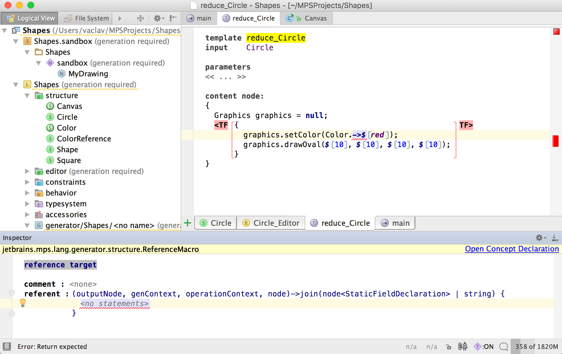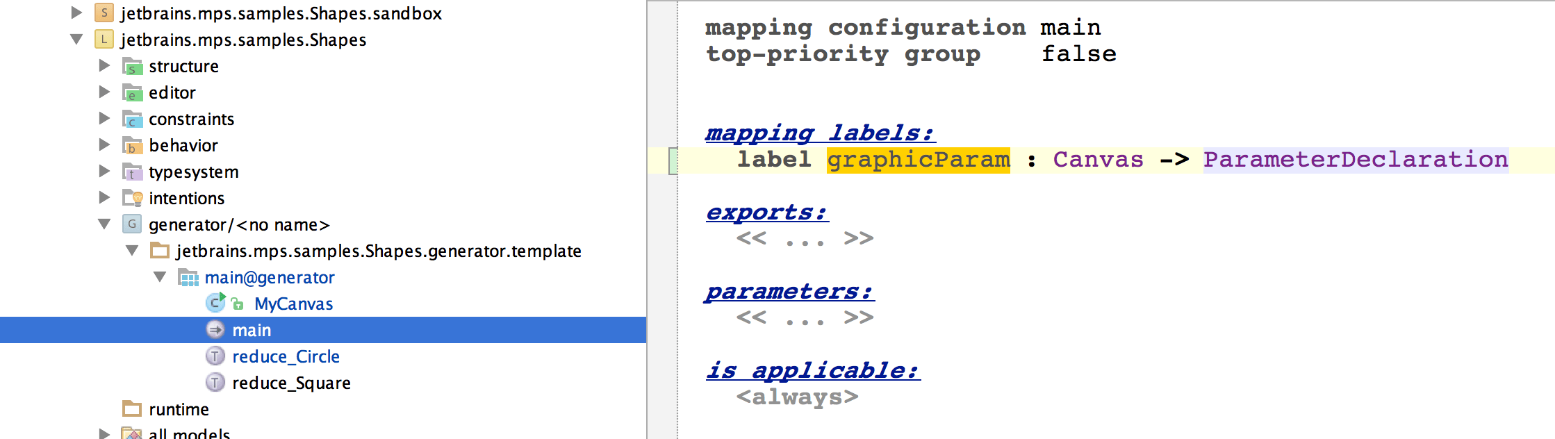 Now we get Canvas to be translated into a Java class and we also made a place for Shapes to add the code that will draw them. The time is up for us to define the actual translation rules for Shapes themselves, so that we get a "graphics.drawCircle()" method inserted in the generated code as a replacement for the Circle shape. You need to open the main mapping configuration and add a new entry to the "reduction rules" section: