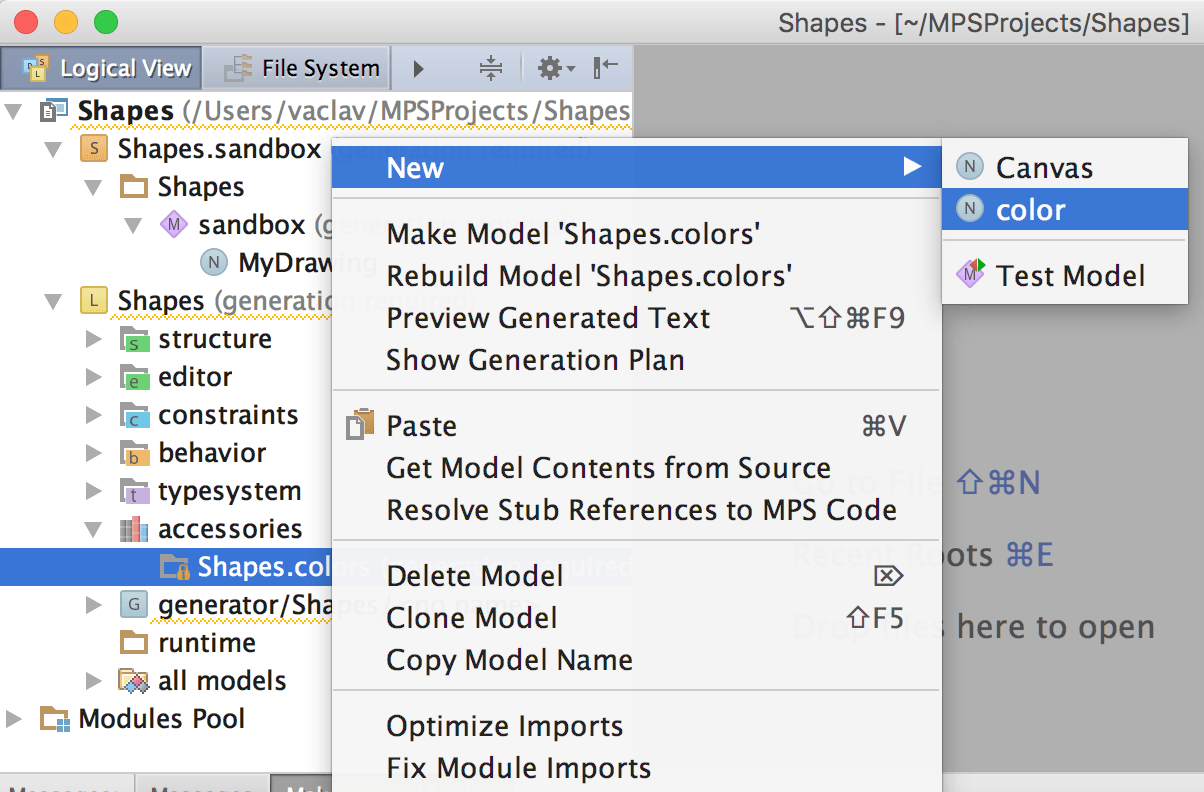 Once built, the language will be available for use in the model inside the sandbox Solution. Create a new Canvas by right-clicking on the model and choosing the root concept to instantiate. Notice, the root concepts are those that show up in this menu and can be instantiated at the top-most level within a model.