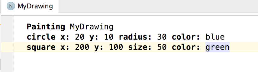 Now you should try yourself to create a concept for square. Repeat the steps we did for Circle, just create different properties - upperLeftX and upperLeftY to hold the coordinates of the upper-left corner followed by size to specify the length of the sides of the square. Ultimately you should get to this: