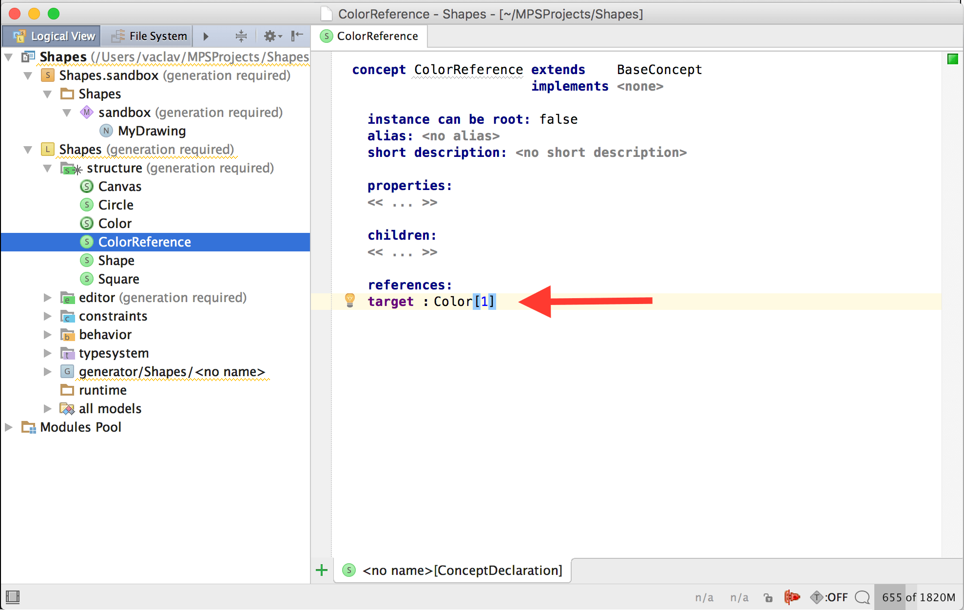 We should give the Concept a descriptive name, Shape in our case will work fine. So just type Shape where MPS indicates a missing name - the red <no name> field.