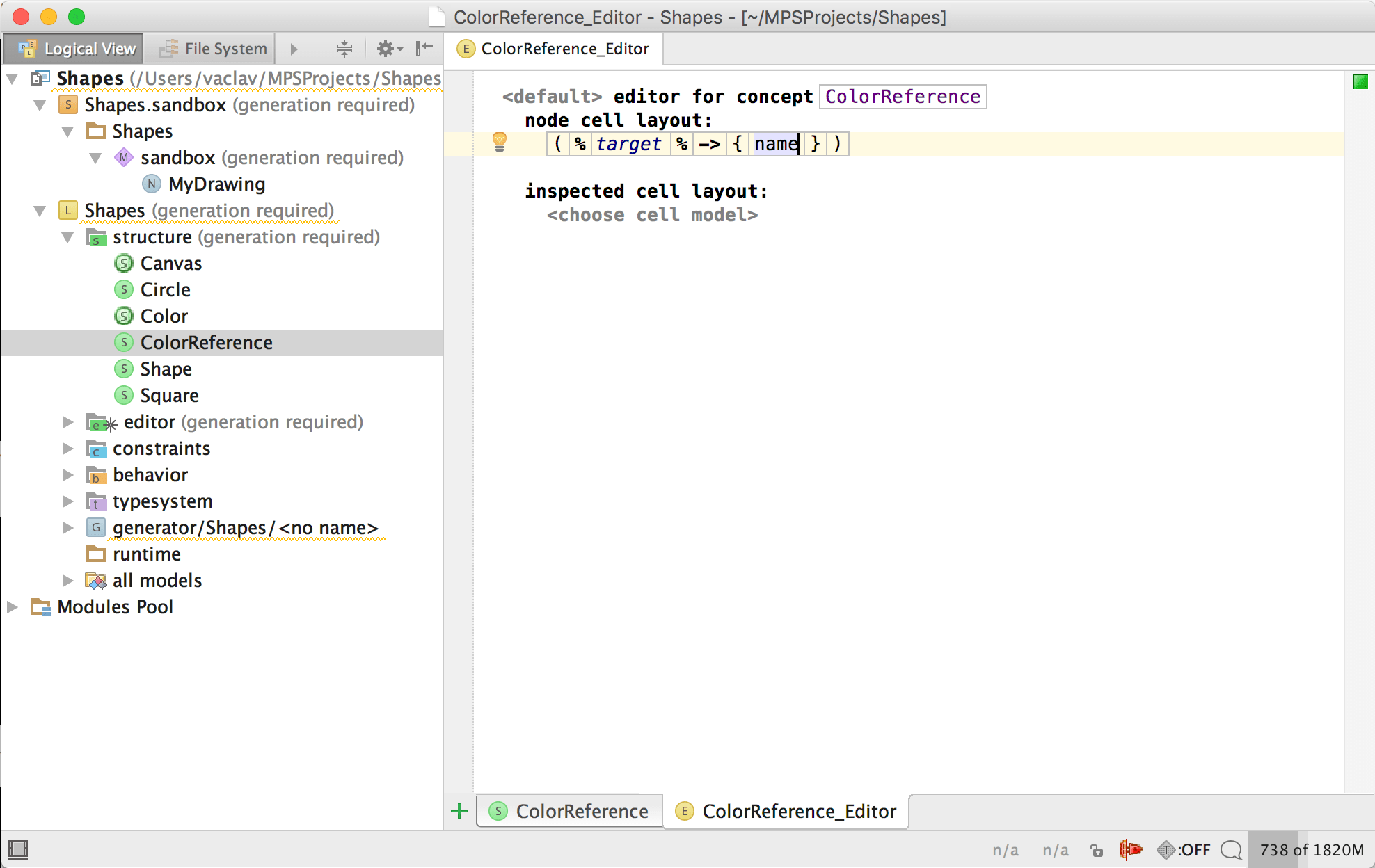 Since node is an instance of the Circle concept, node.color is the circle's reference to the color (an instance of ColorReference) and node.color.target is a Color (an instance of the Shapes.Color concept) from the accessory model.