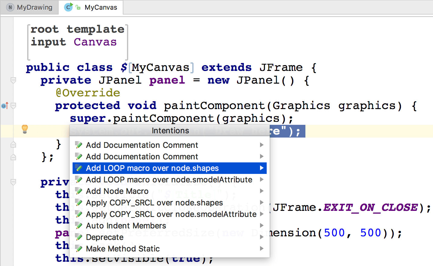 Our template assumes the code that draws shapes should be placed inside the paintComponent method of the JPanel field. The statement "System.out.println("Draw here");" serves as a placeholder for the real code that will draw all shapes. We will use the COPY_SRC macro to replace the placeholder statement with a statement that draws a single shape and we'll leverage the LOOP macro to repeat that for all shapes defined in the current Canvas.