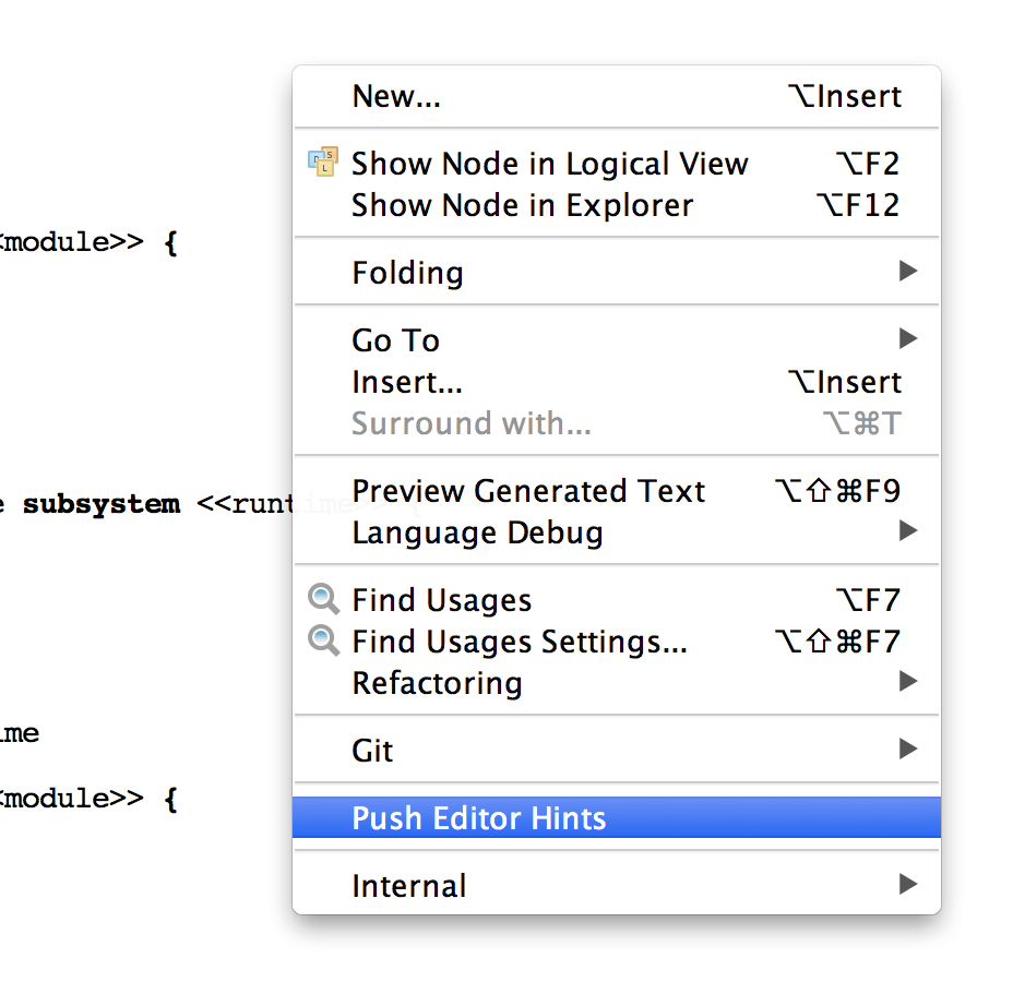 Elements get created when the user double-clicks in the editor. If multiple element types are available, a completion popup menu shows up.