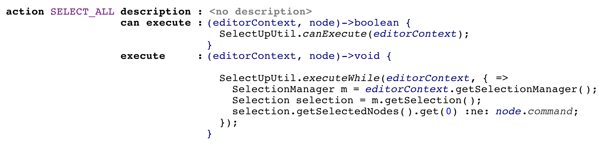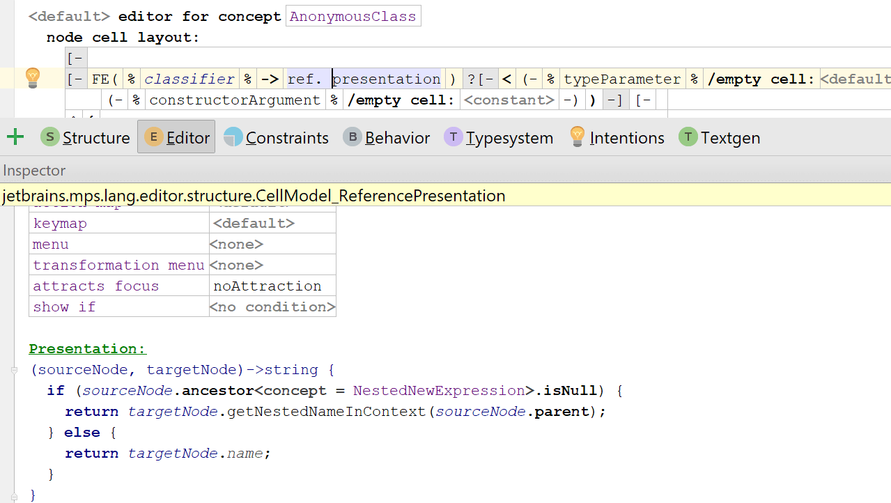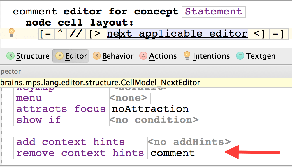 Next applicable editor | A more specific editor may reuse a less specific editor of the same concept through the new next applicable editor editor cell. The next applicable editor cell is used as a place holder, which will re-apply the logic for finding the less specific editor and insert the found editor in its place. For example, an editor specific to a particular context hint may provide some visual ceremony around a next applicable editor cell. By removing the context hint on the next applicable editor cell, MPS will reevaluate the editor-discovery logic and supply the found editor into the next applicable editor cell. ![]() In particular this mechanism is frequently being used to implement editors for "commented out" nodes when customizing the generic comment out functionality. |