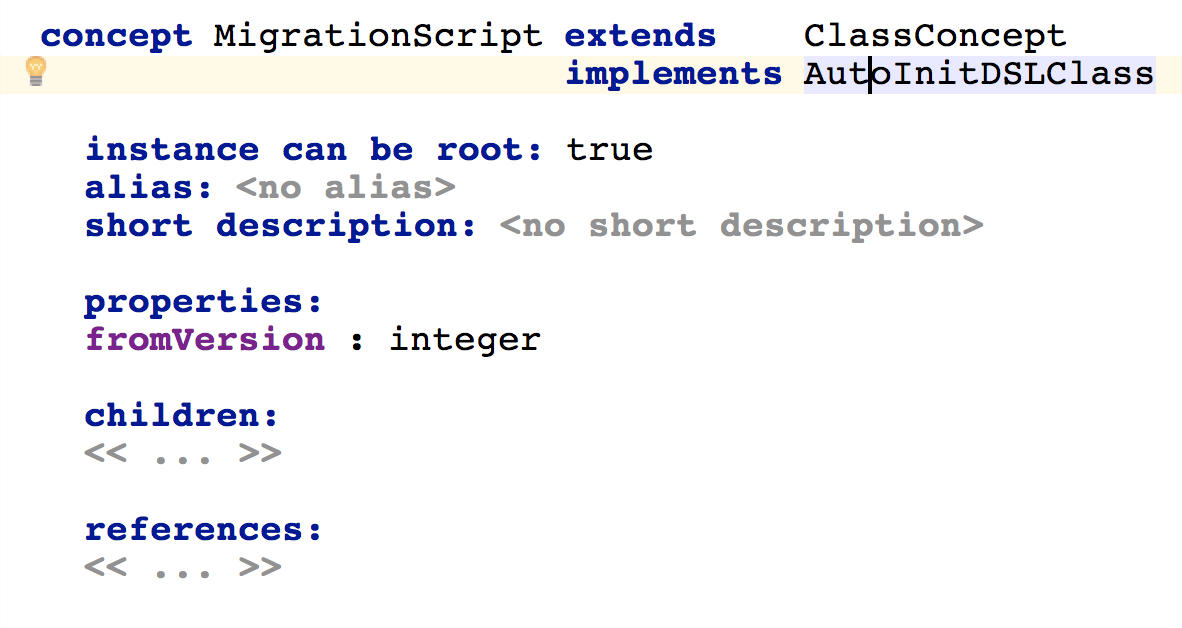MigrationScript concept, which is a mere BaseLanguage class, is enhanced by the Migration DSLDescriptor that adds a few extra properties, members and custom members