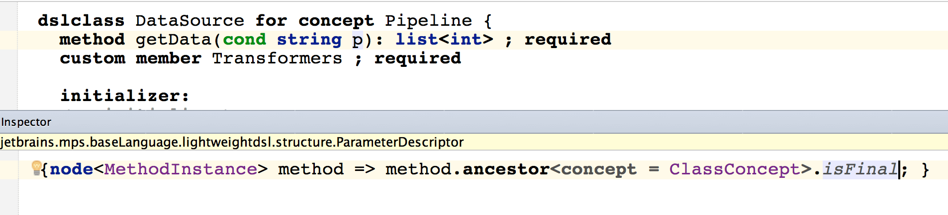 The core idea behind the Lightweight DSL language is to allow the DSL designer to define interfaces with constraints, such as optional methods and properties, types depending on constraints, optional method parameters, custom class members and others. The DSLDescriptor concept represents nodes that codify such constrained interfaces that should be enforced on implementing Classes. For example, the following DSLDescriptor instance will weave a numberOfFrames property into classes as well as a calculateFoo() method and a custom BuilderMember node: