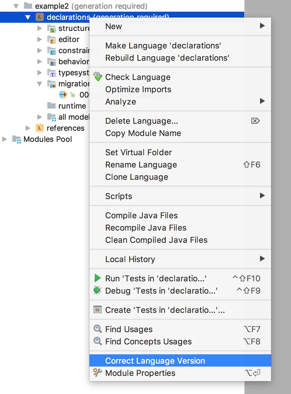 • If a migration is created by mistake and wasn't published (meaning no user has run it on his project), it can be freely removed. After removing the migration, execute "Correct Language version" from the language's context menu - this action allows to synchronize the language's version with the last migration's version. BE VERY CAREFUL when doing this.