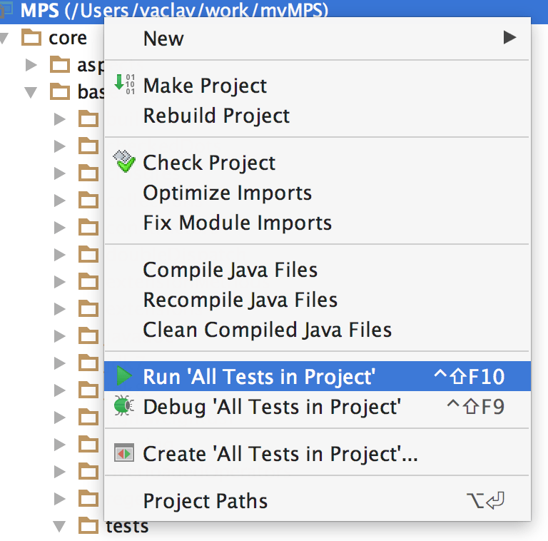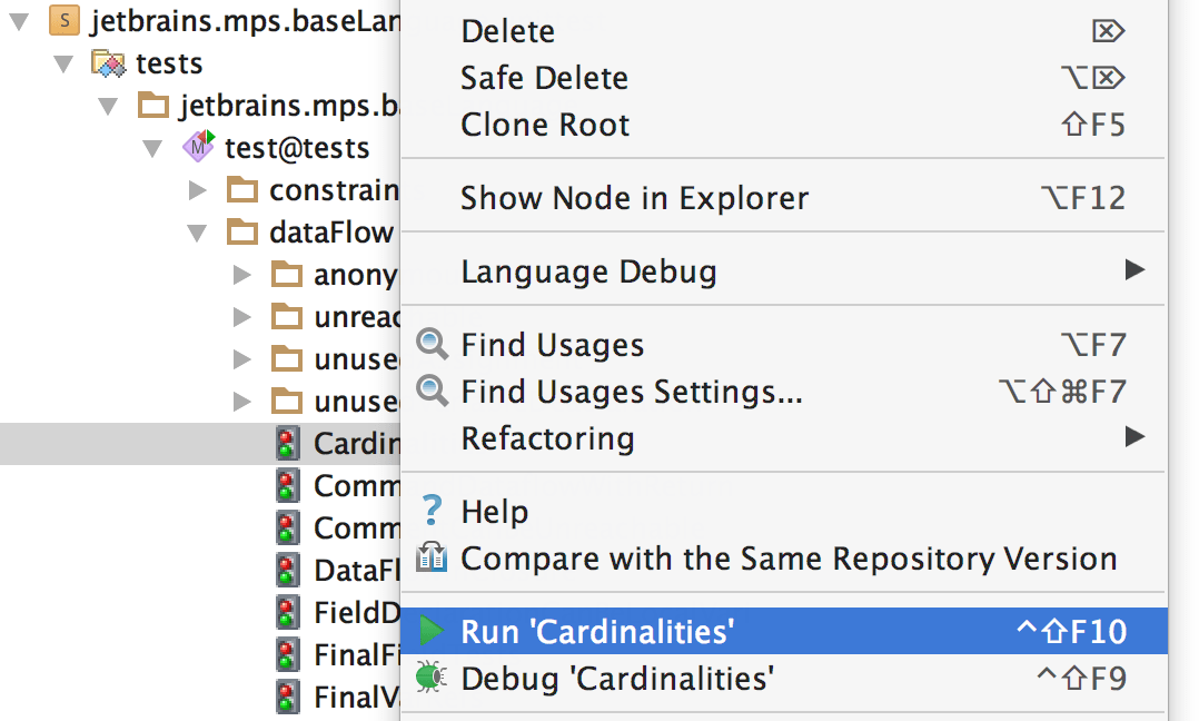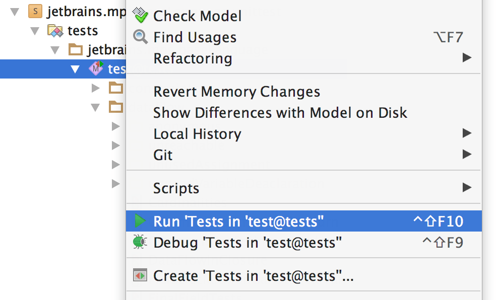 Run configurations could also be executed/created for nodes, models, modules and projects. For example, the JUnit run configuration could run all tests in a selected project, module or model. For more information about implementing such behavior for your own run configurations, refer to Producers.